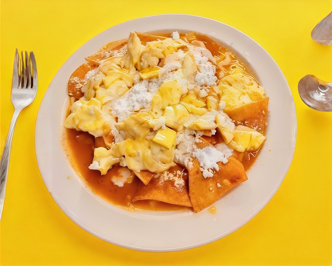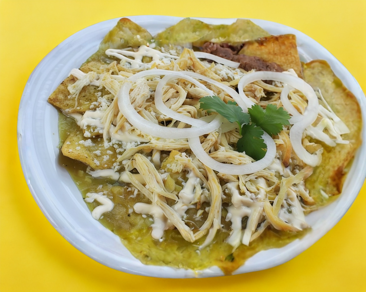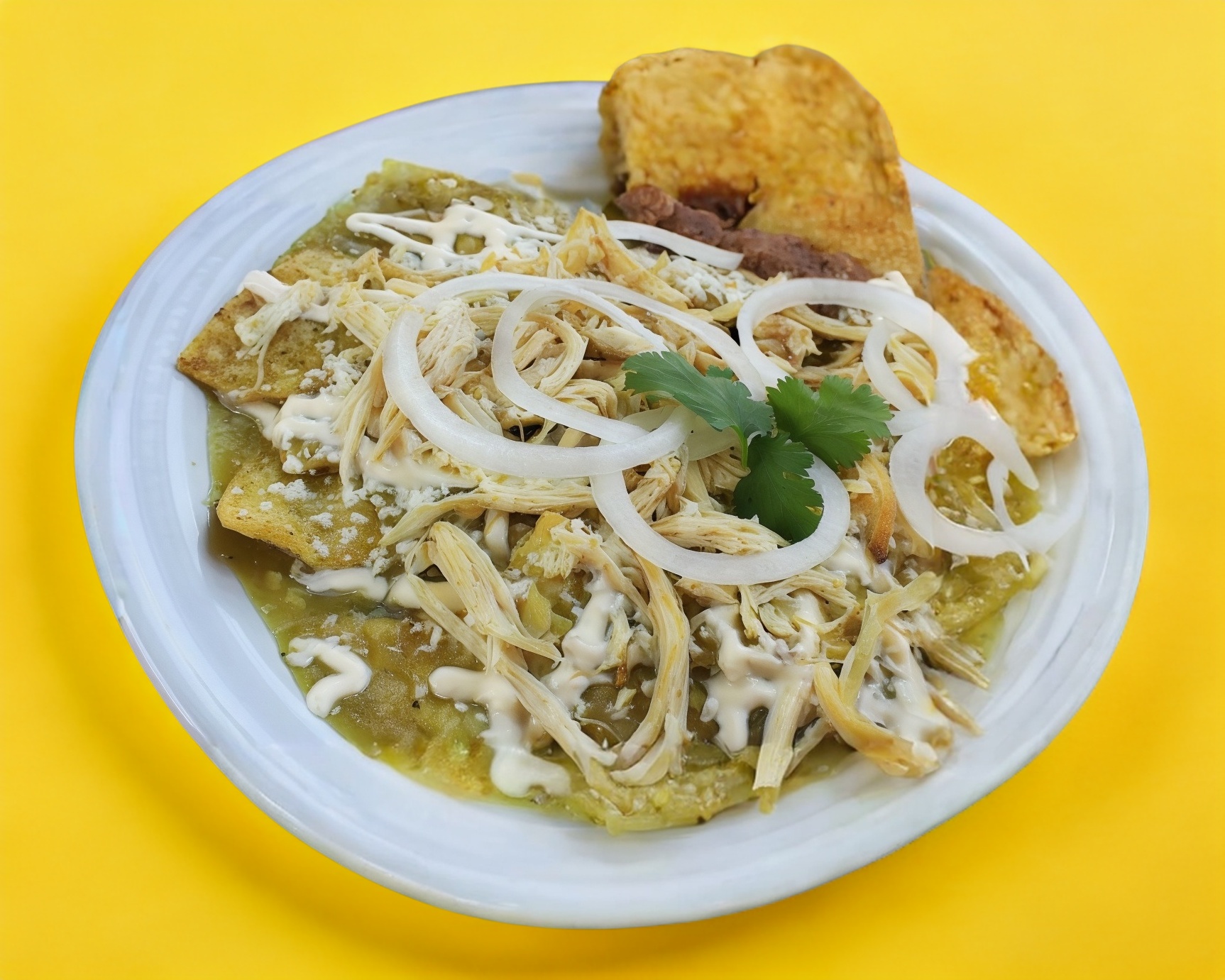 Chilaquiles verdes con huevo revuelto o estrellado, con queso, crema, cebolla y pan