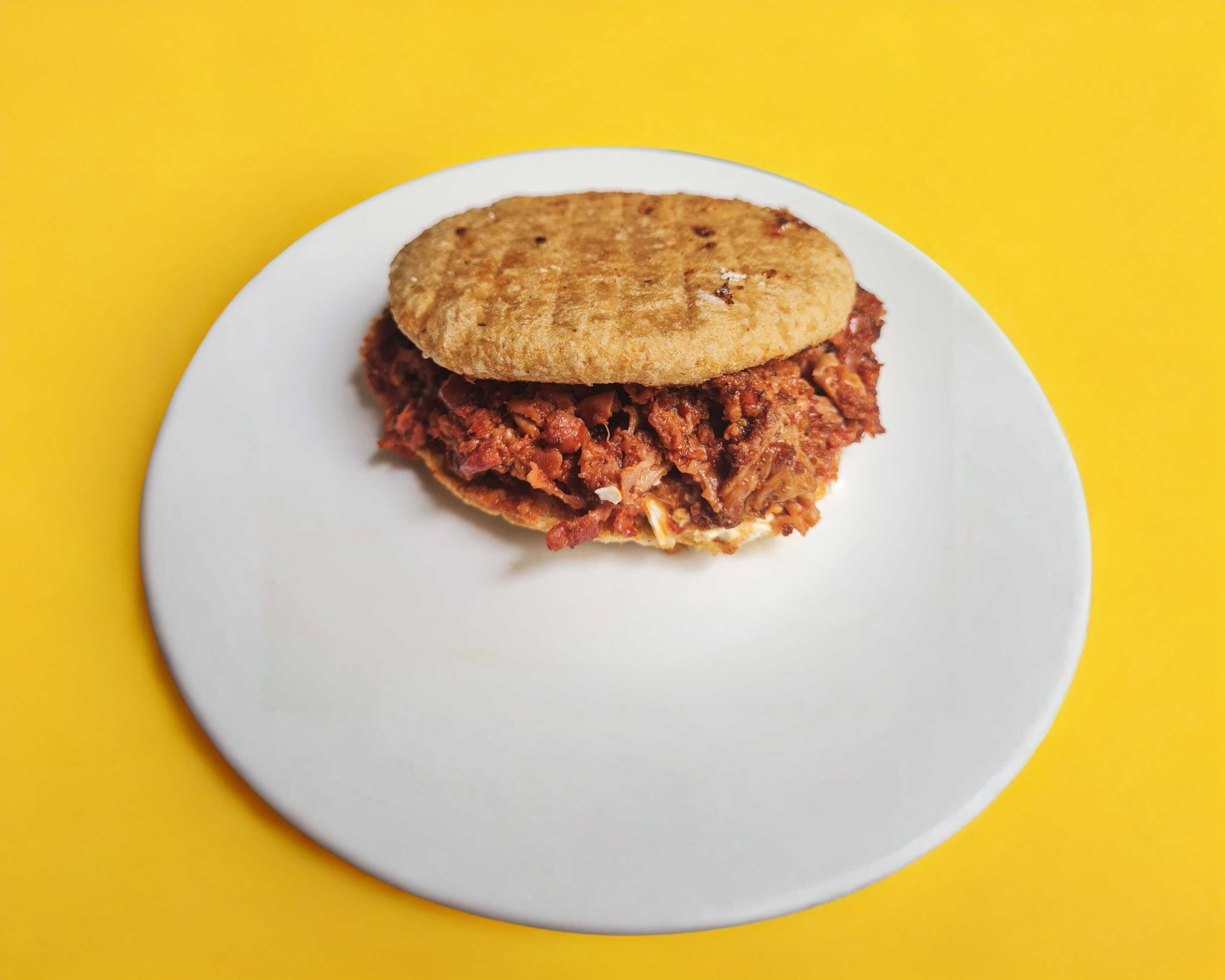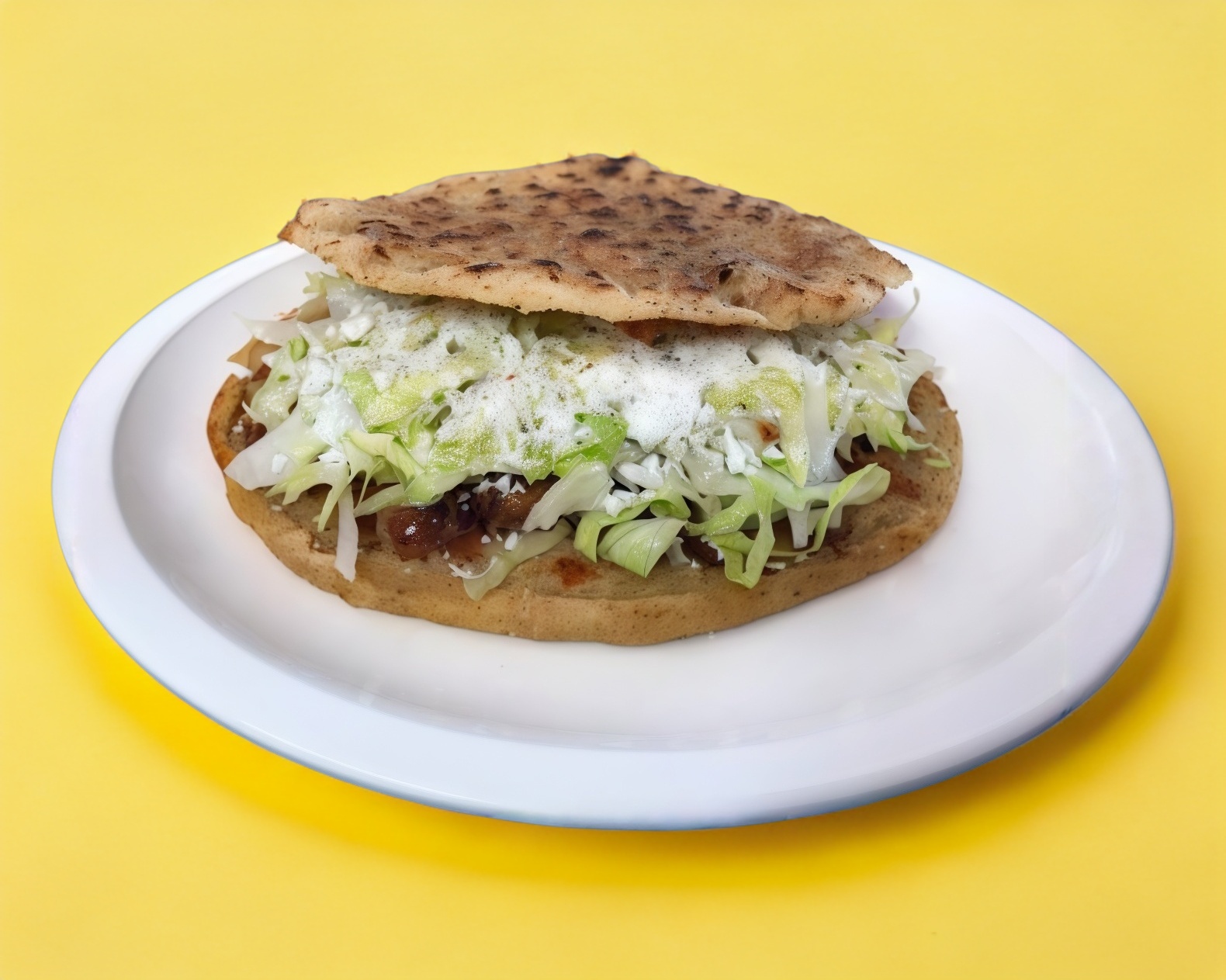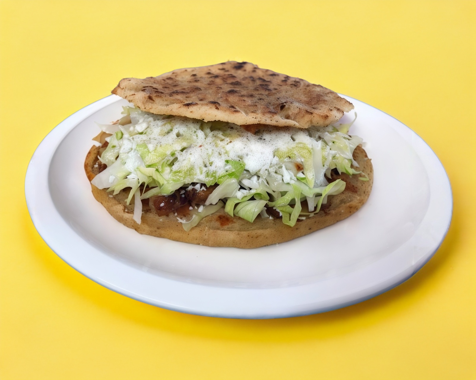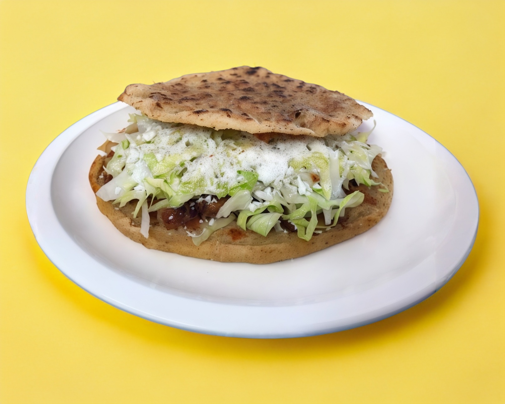 Gordita de chicharrón con bistec, quesillo, cebolla, cilantro, lechuga y queso rallado.