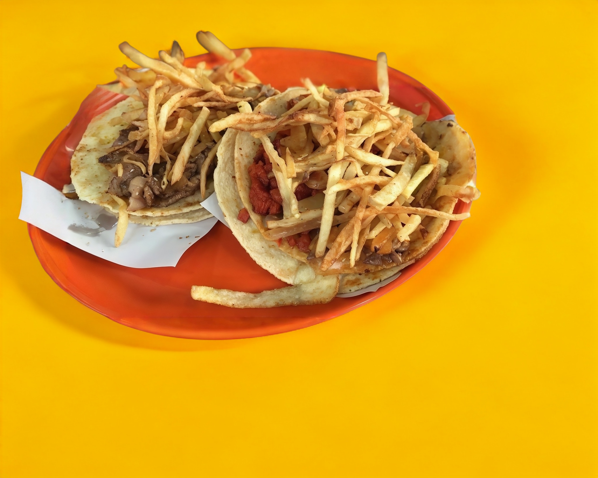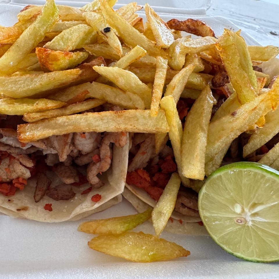 Orden de dos tacos de chorizo con queso con papas a la francesa