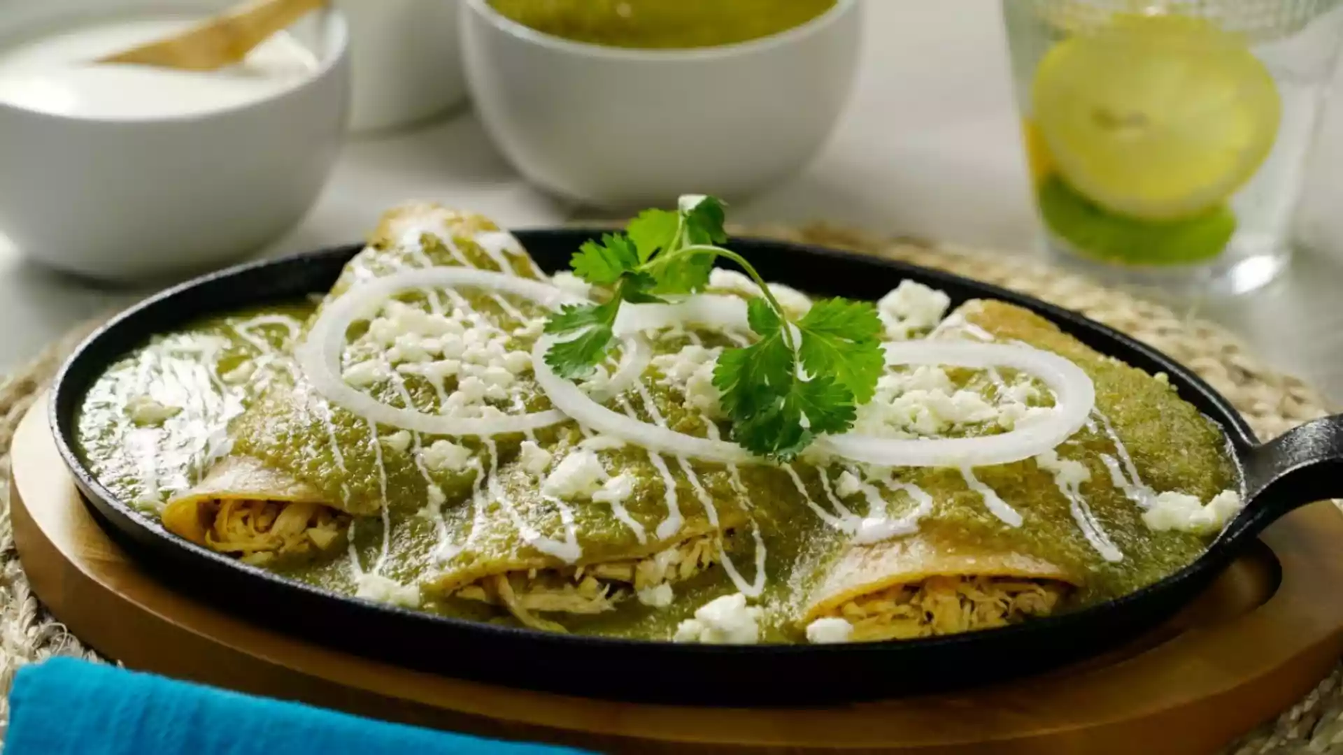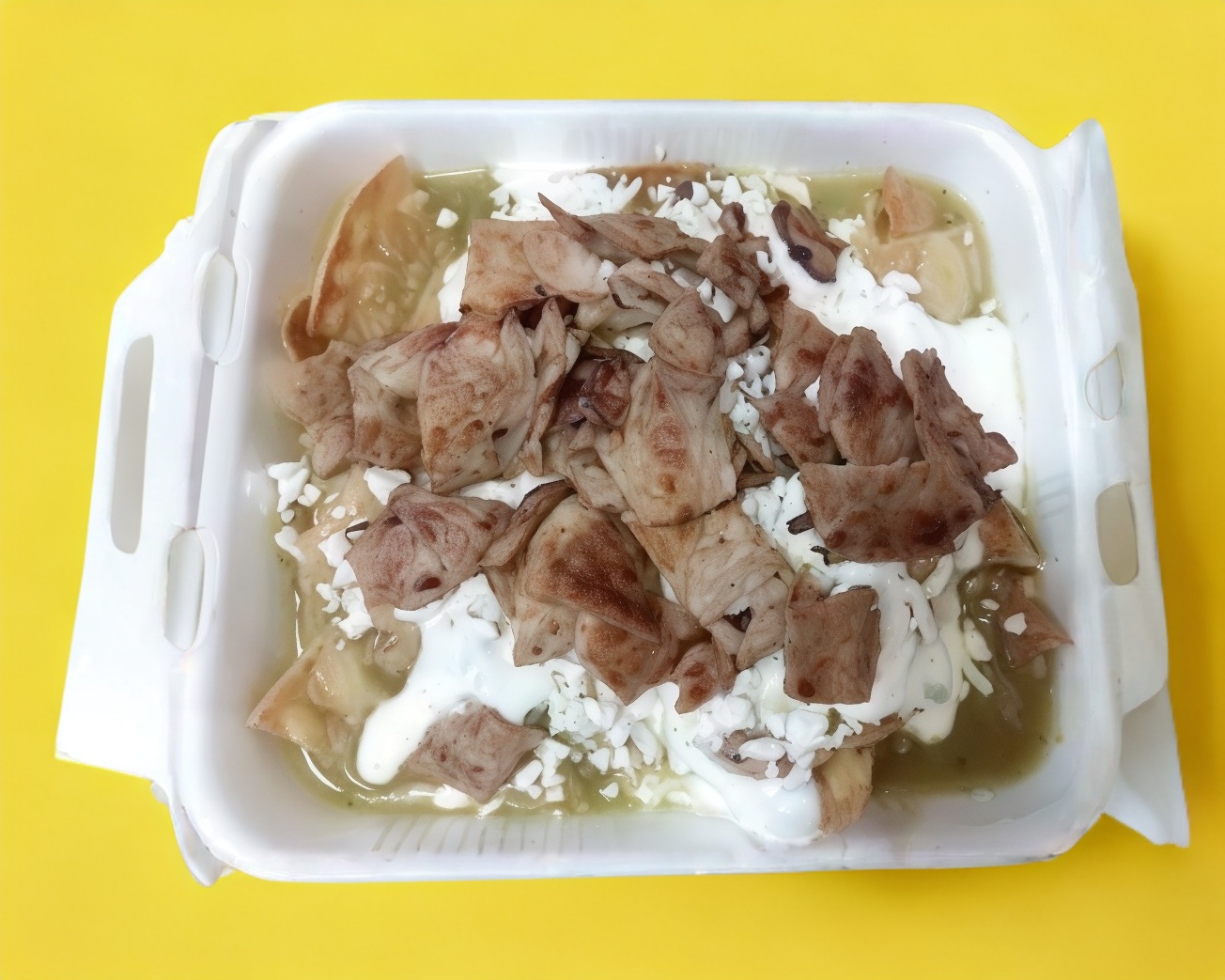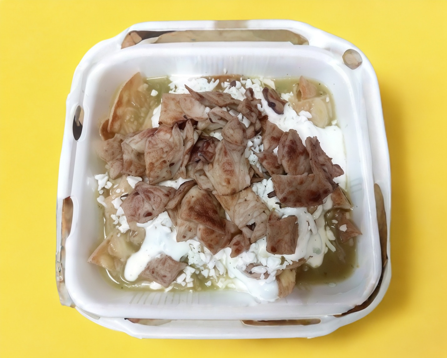 Chilaquiles verdes con bistec, con queso, crema, cebolla y pan