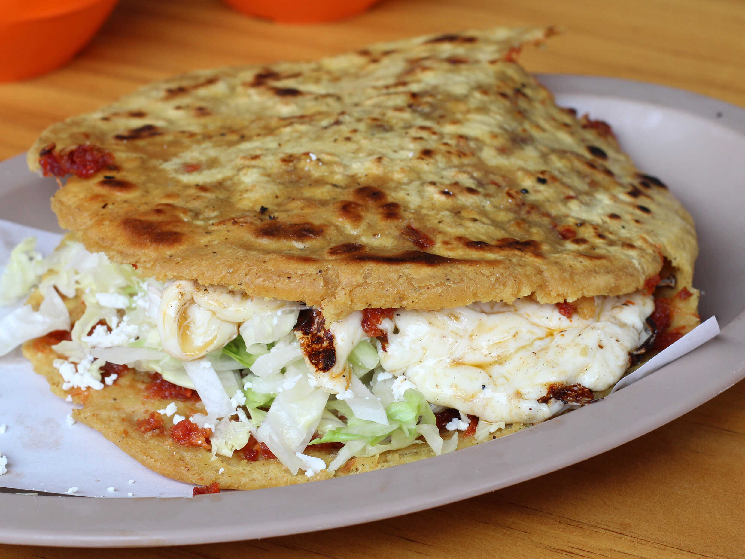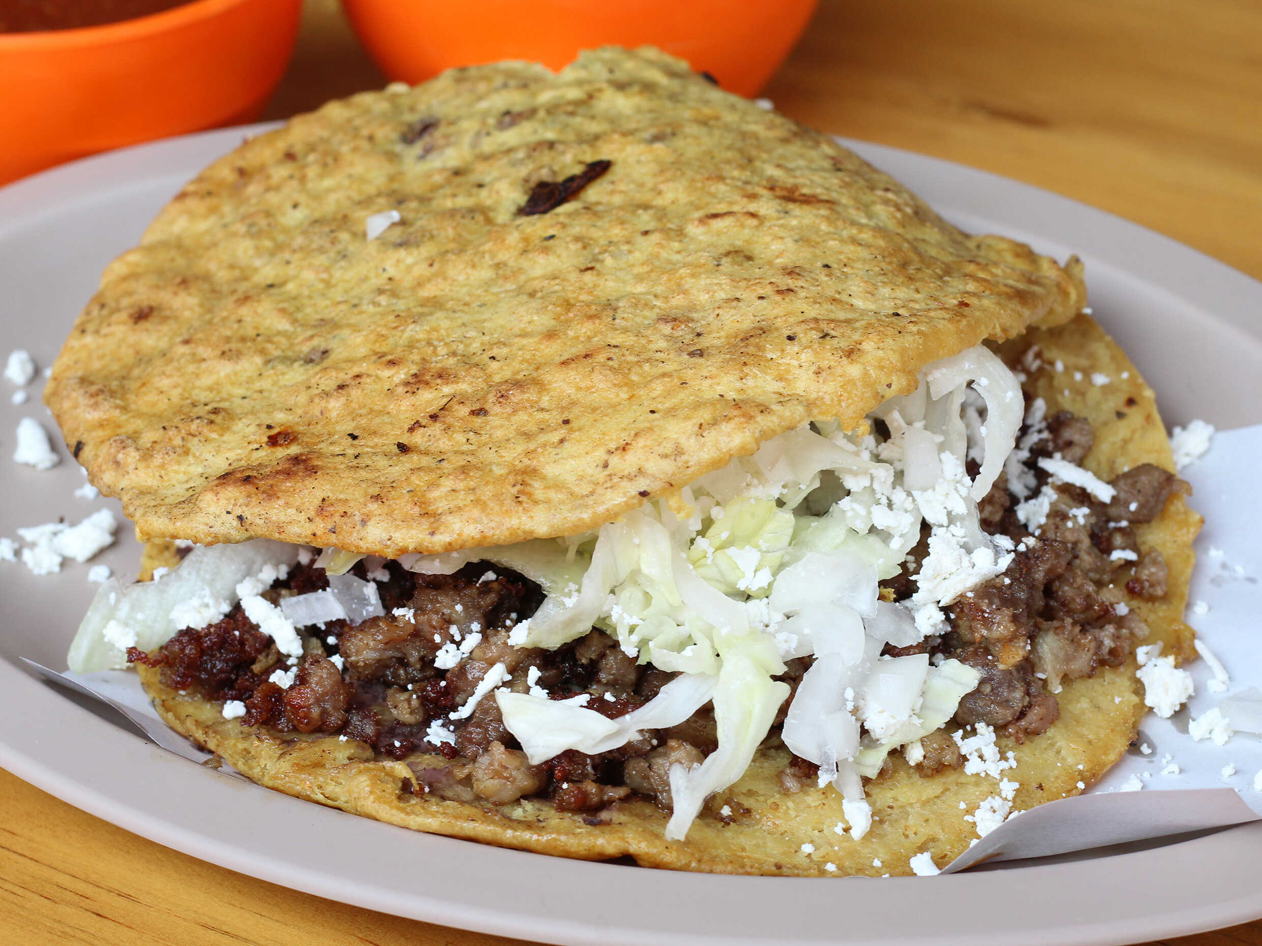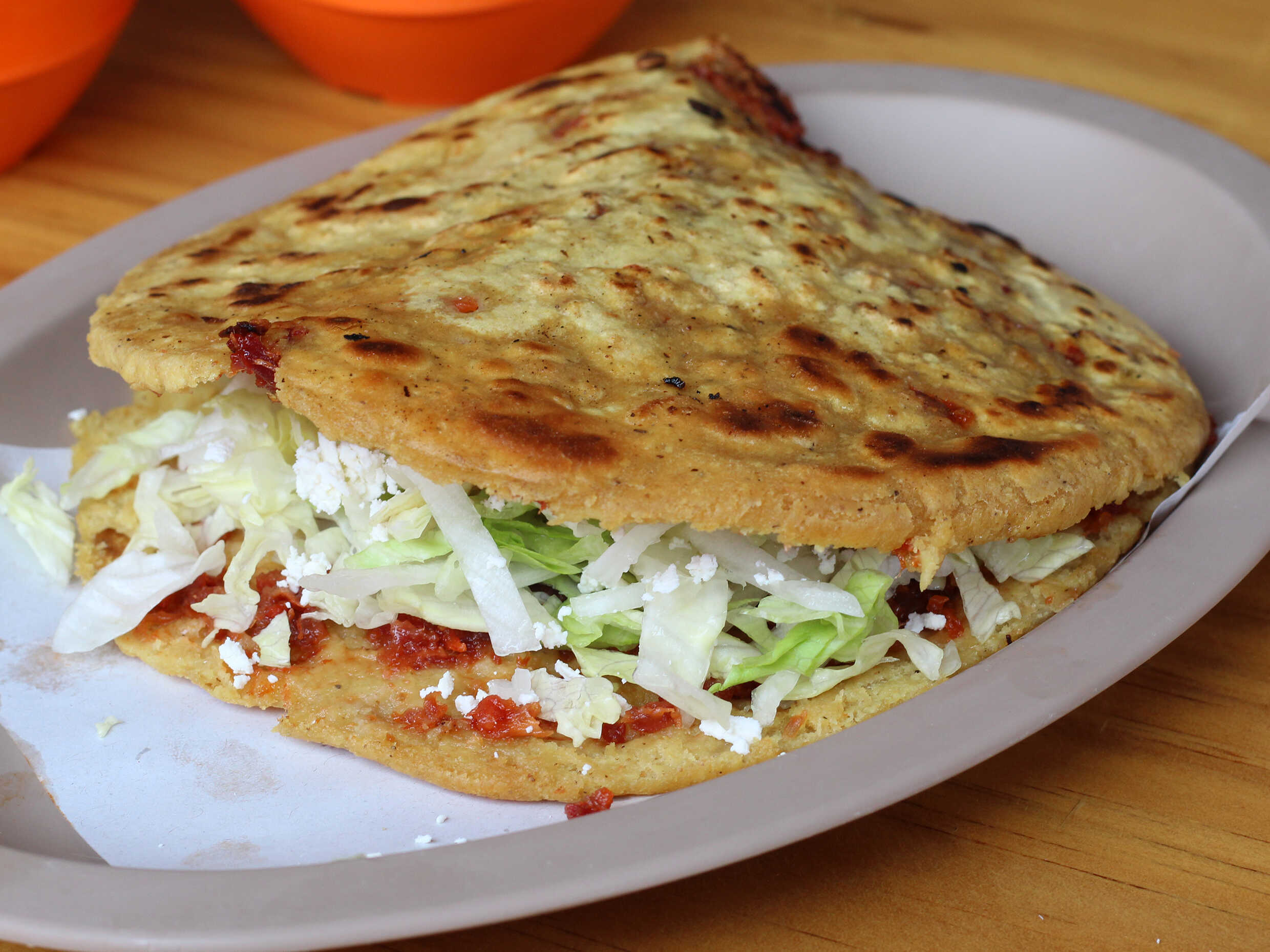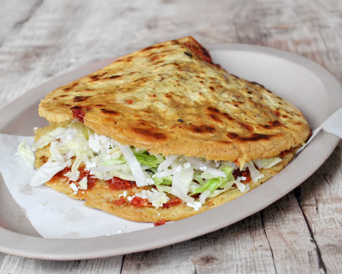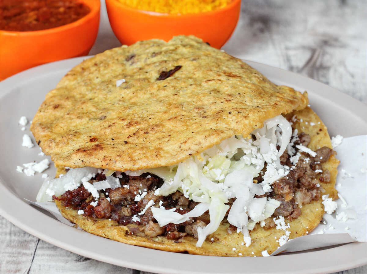 Gordita rellena de suadero, acompañada de queso rallado y lechuga.
