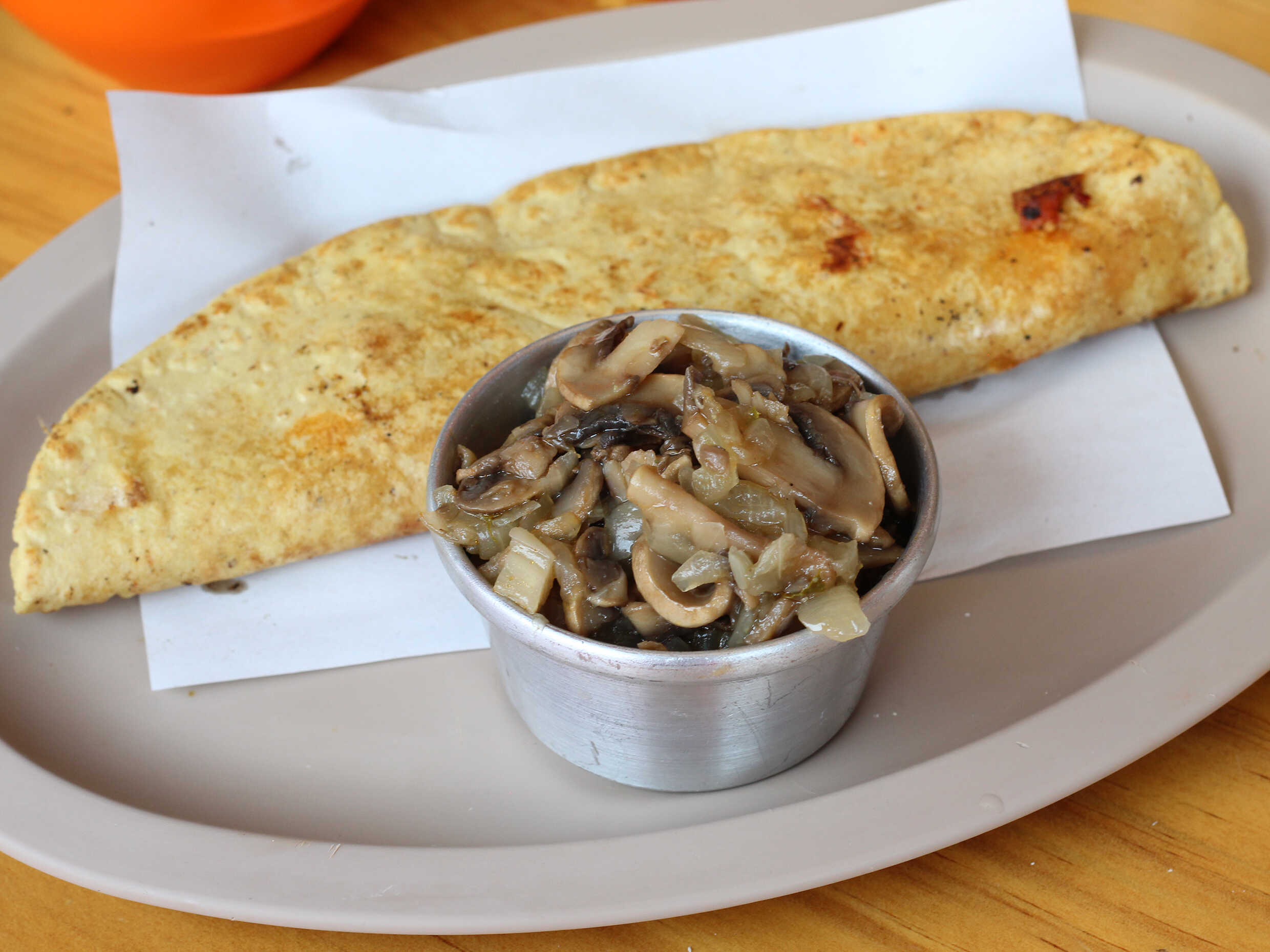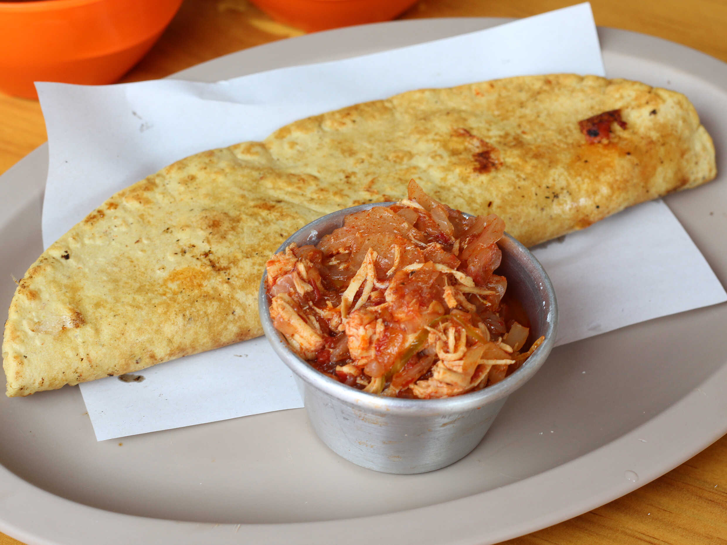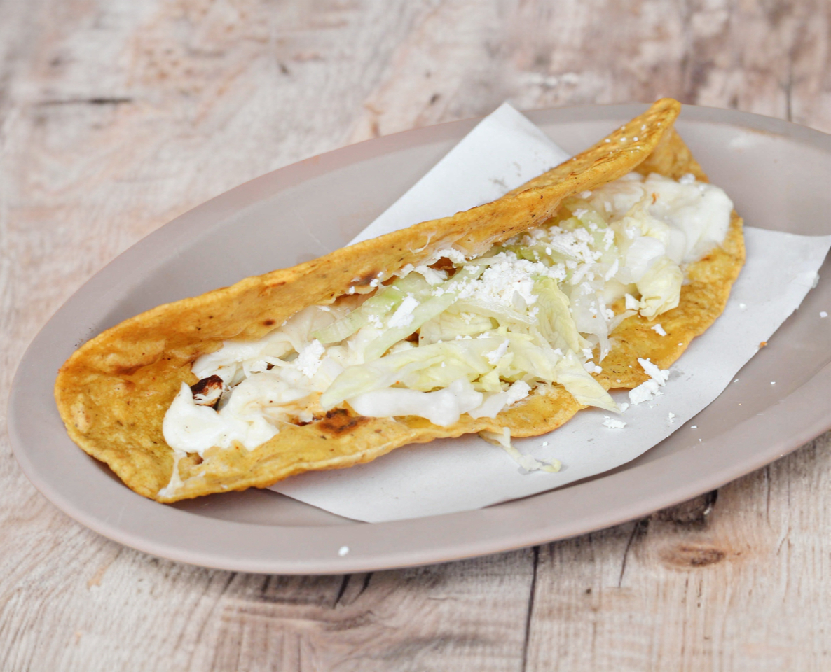 Queka de quesillo huajaca 1unidad (120gr), acompañada de lechuga y queso rallado. Salsa aparte