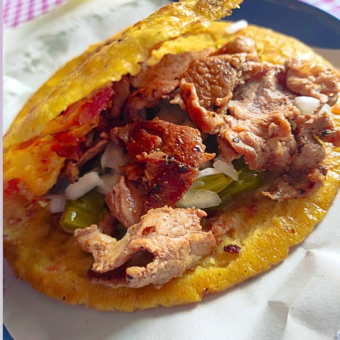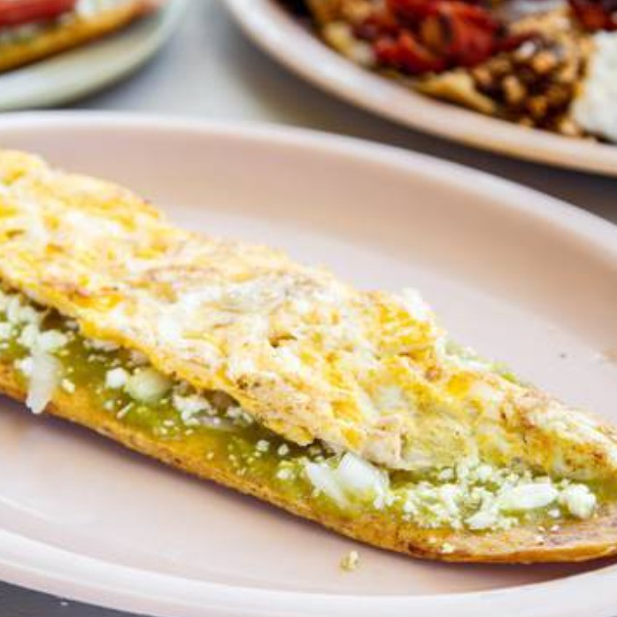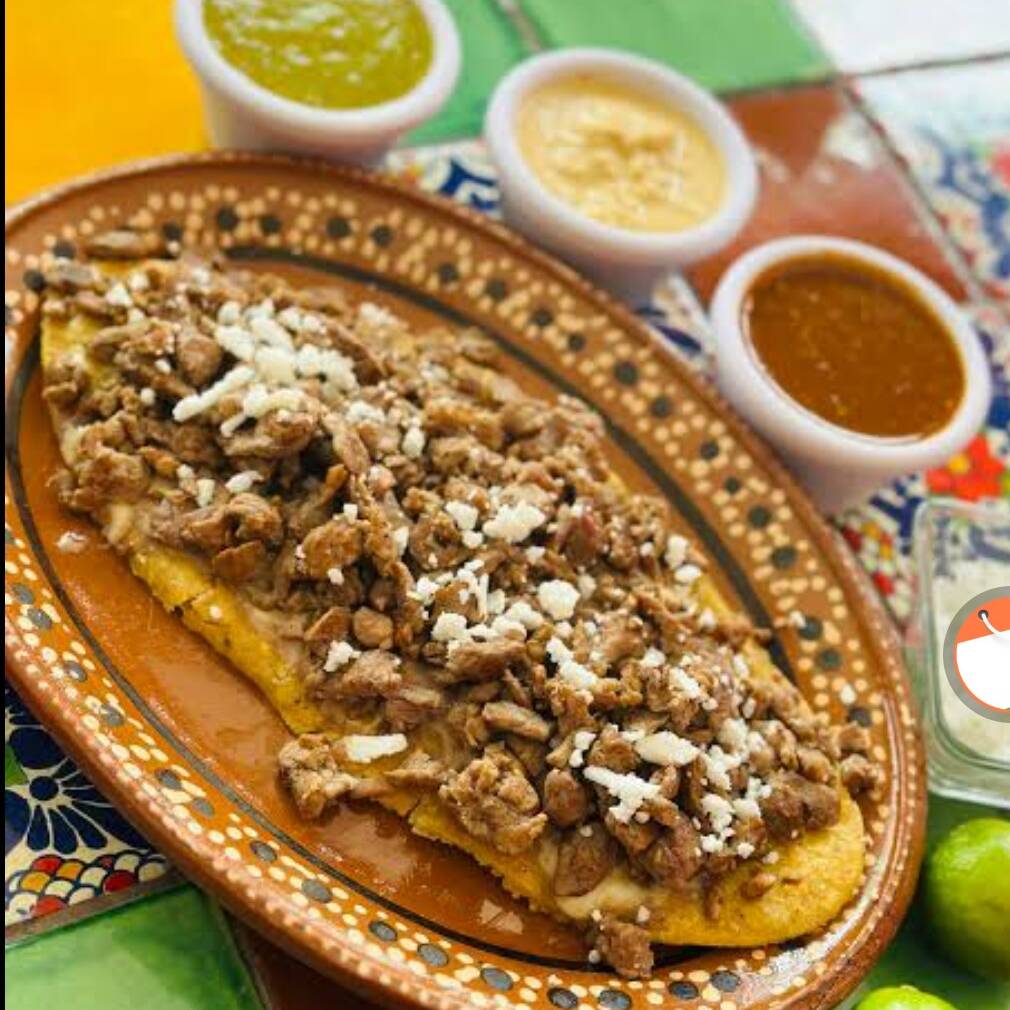 150 gramos de masa , rellena de bistec con longaniza , queso, cebolla, nopales