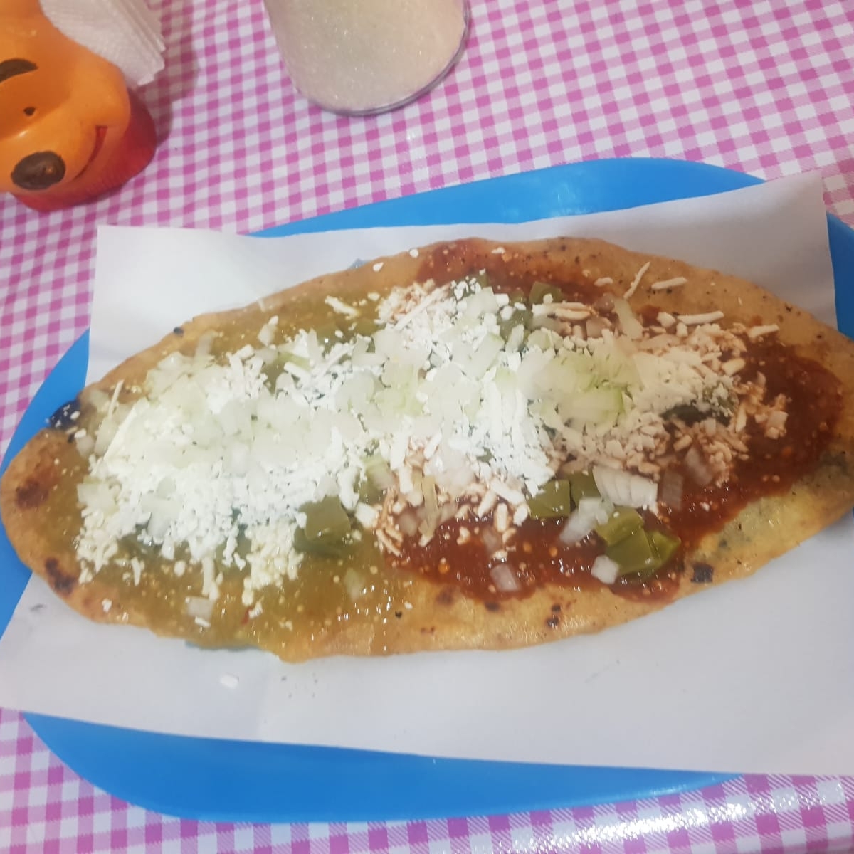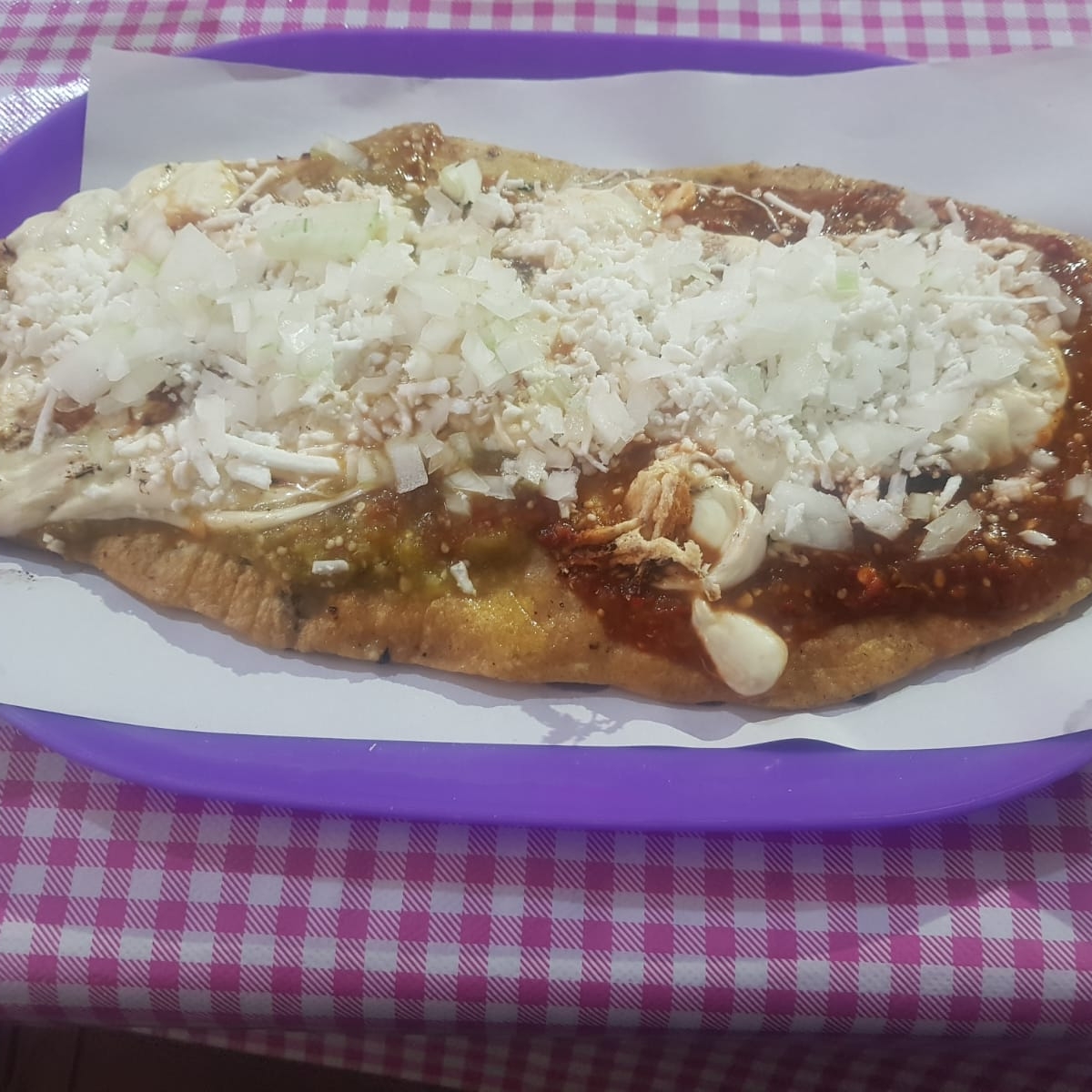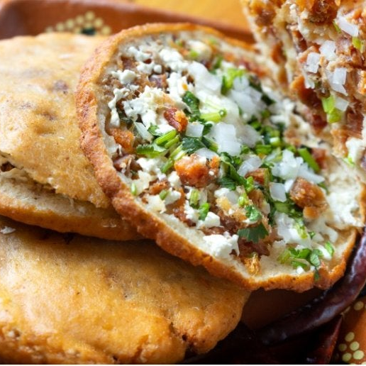 150 gramos de masa , rellena de chicharron , queso, cebolla, nopales