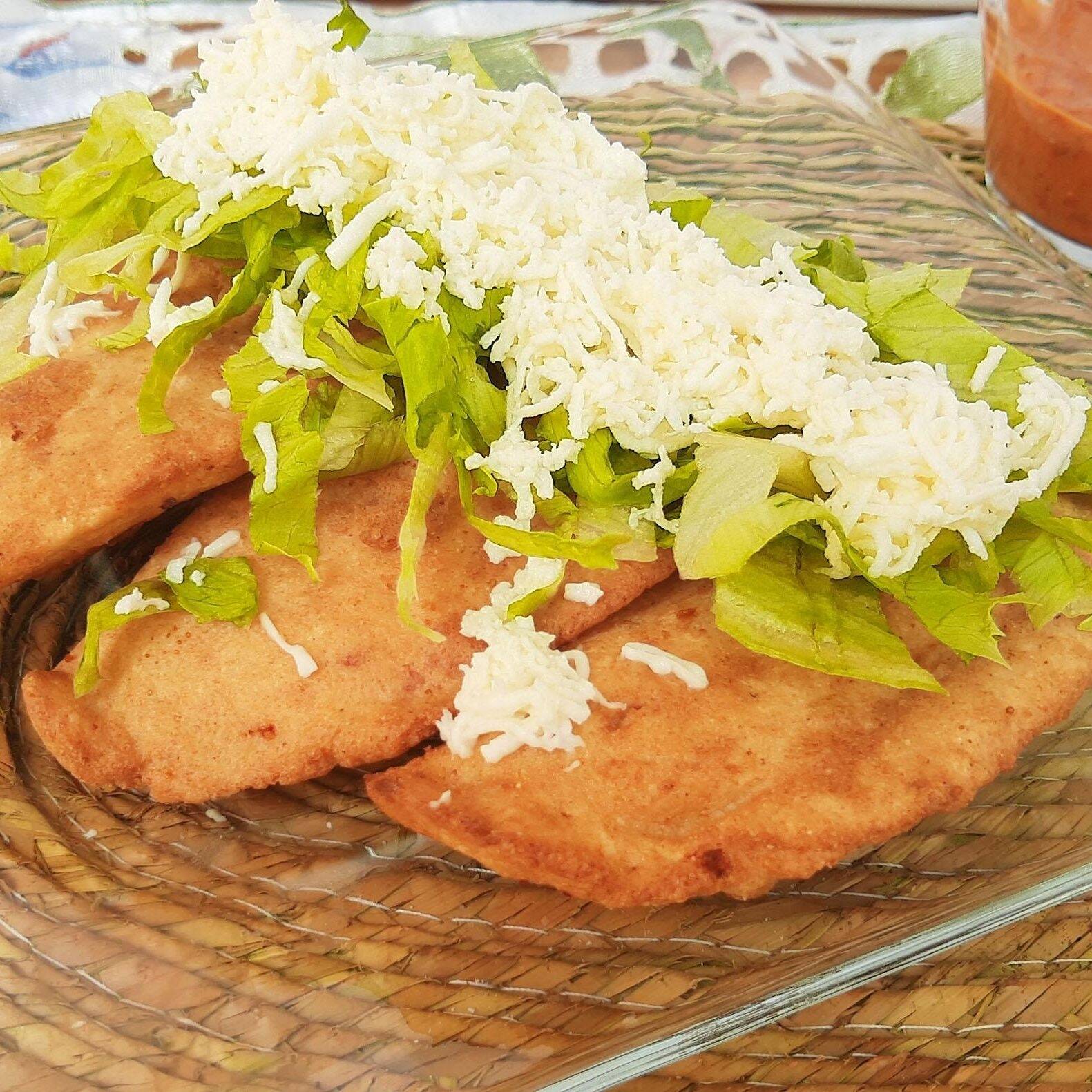 3 quesadillas fritas preparadas con lechuga, crema, queso