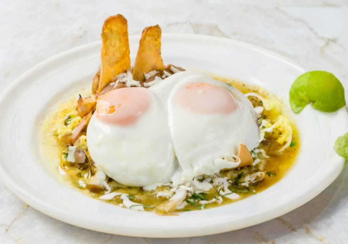 Orden de chilaquiles con Huevo acompañados de Frijoles a un lado con Crema, Queso y Cebolla al gusto. Con pan.