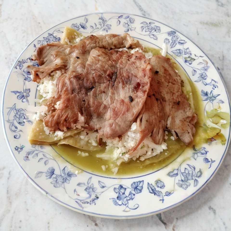 Enchiladas (5) con un Bistec de Res con queso, crema y cebolla al gusto. Acompañadas de frijoles y una pieza de pan.