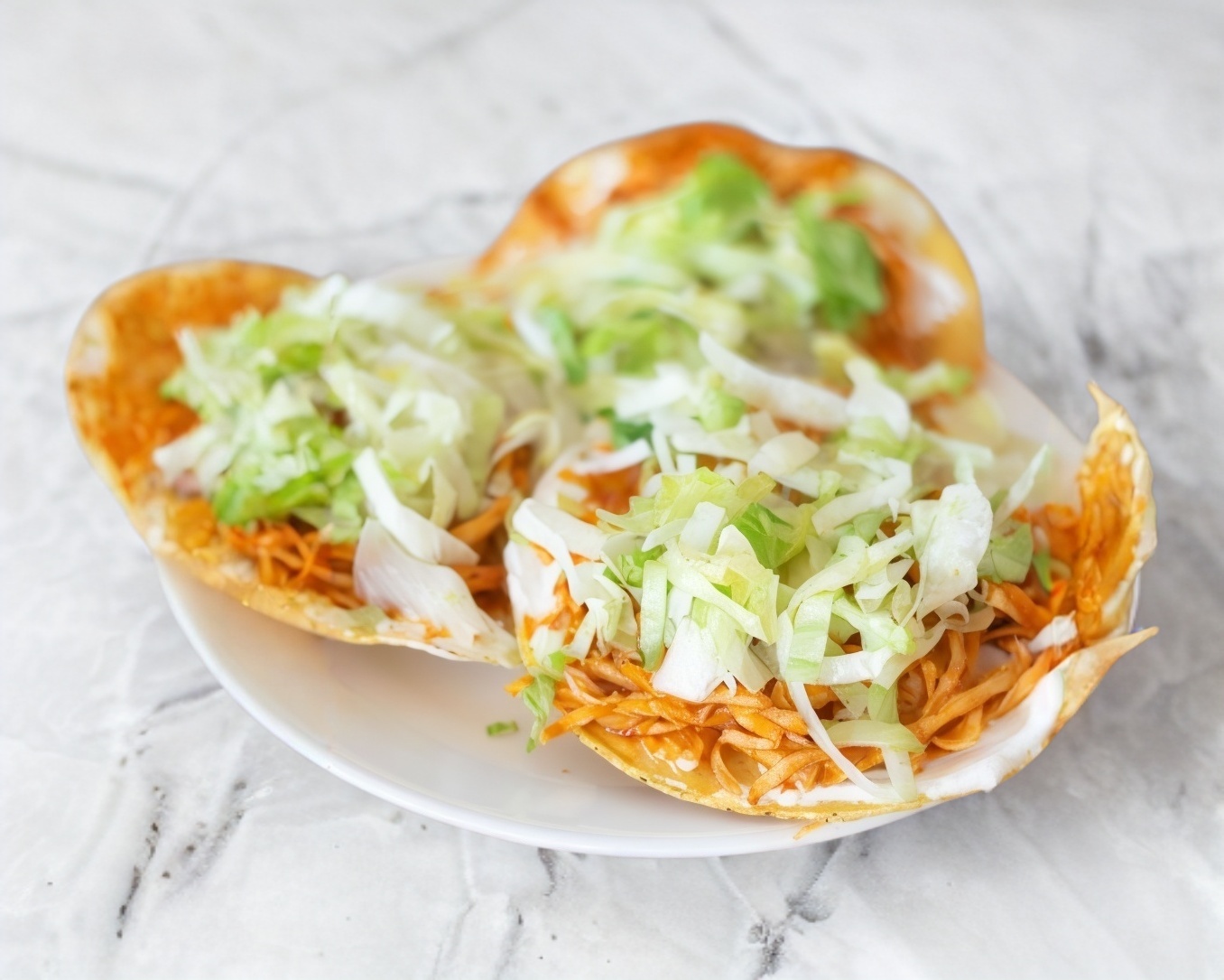 Tostada de Tinga de Pollo acompañada de lechuga, crema, queso y salsa verde de la casa empaquetados aparte para añadir al gusto.