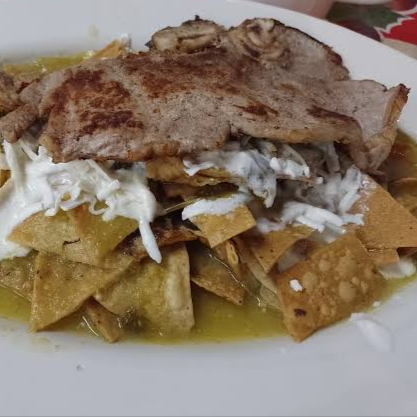Orden de chilaquiles con Bistec de Res acompañados de Frijoles a un lado con Crema, Queso y Cebolla al gusto. Con pan