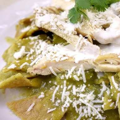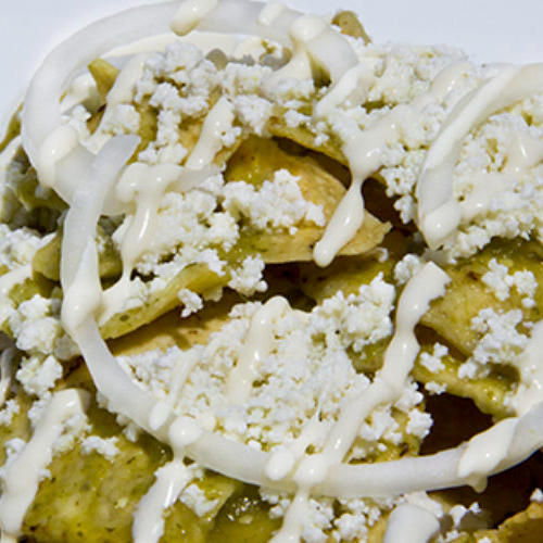 Orden de chilaquiles con Pollo acompañados de Frijoles a un lado con Crema, Queso y Cebolla al gusto. Con pan