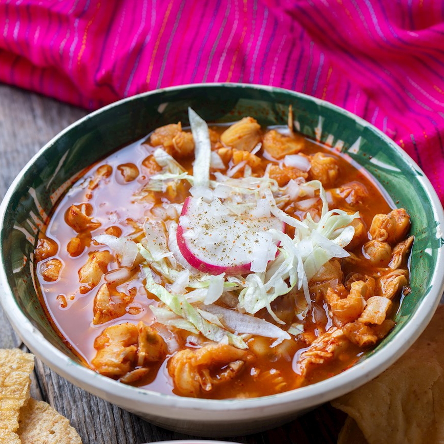 Pozole rojo de cerdo acompañado de Tostadas, Crema, Salsa roja de la casa, Lechuga, Limon y Rabanos.