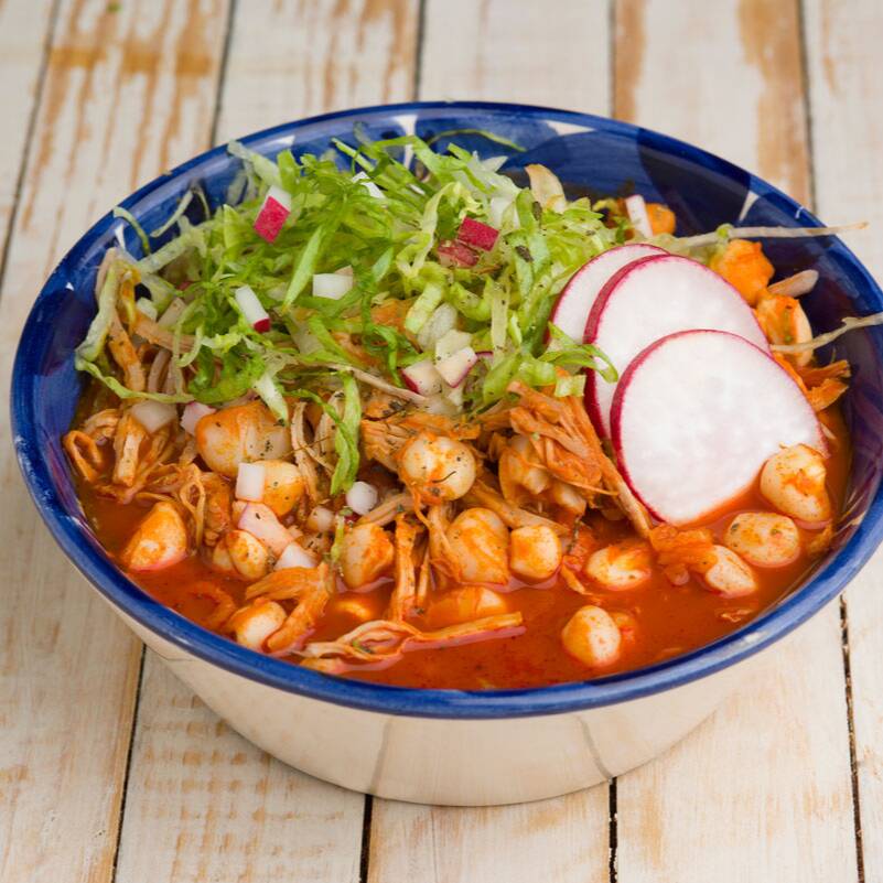 Pozole rojo de maciza con pollo acompañado de Tostadas, Crema, Salsa roja de la casa, Lechuga, Limon y Rabanos.