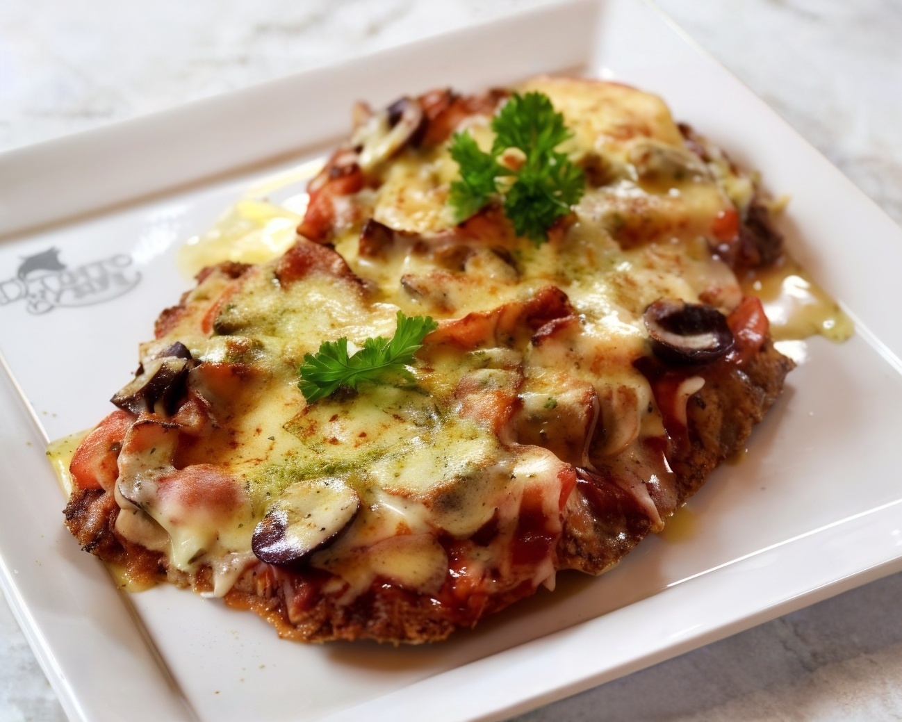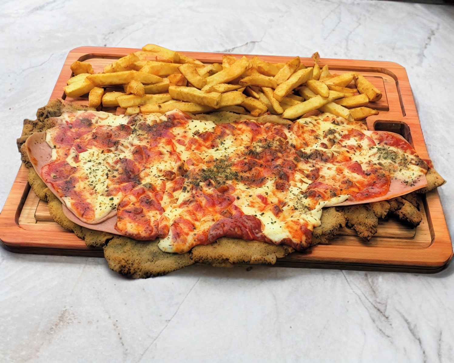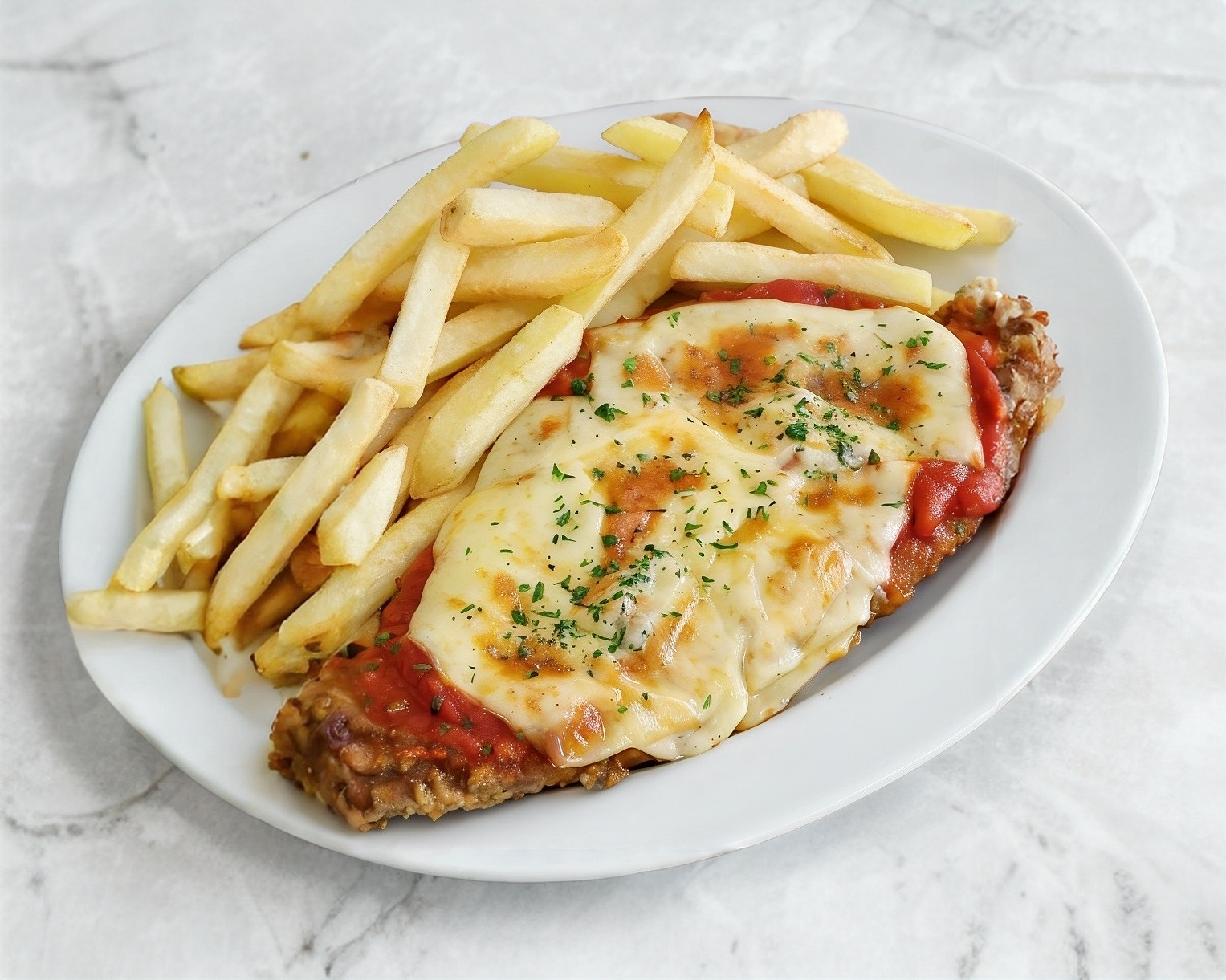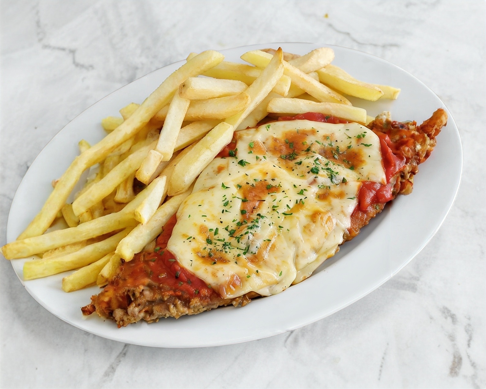 Milanesa con salsa italiana de la casa, gratinada con queso manchego y pepperoni, acompañada de papas a la francesa o ensalada.