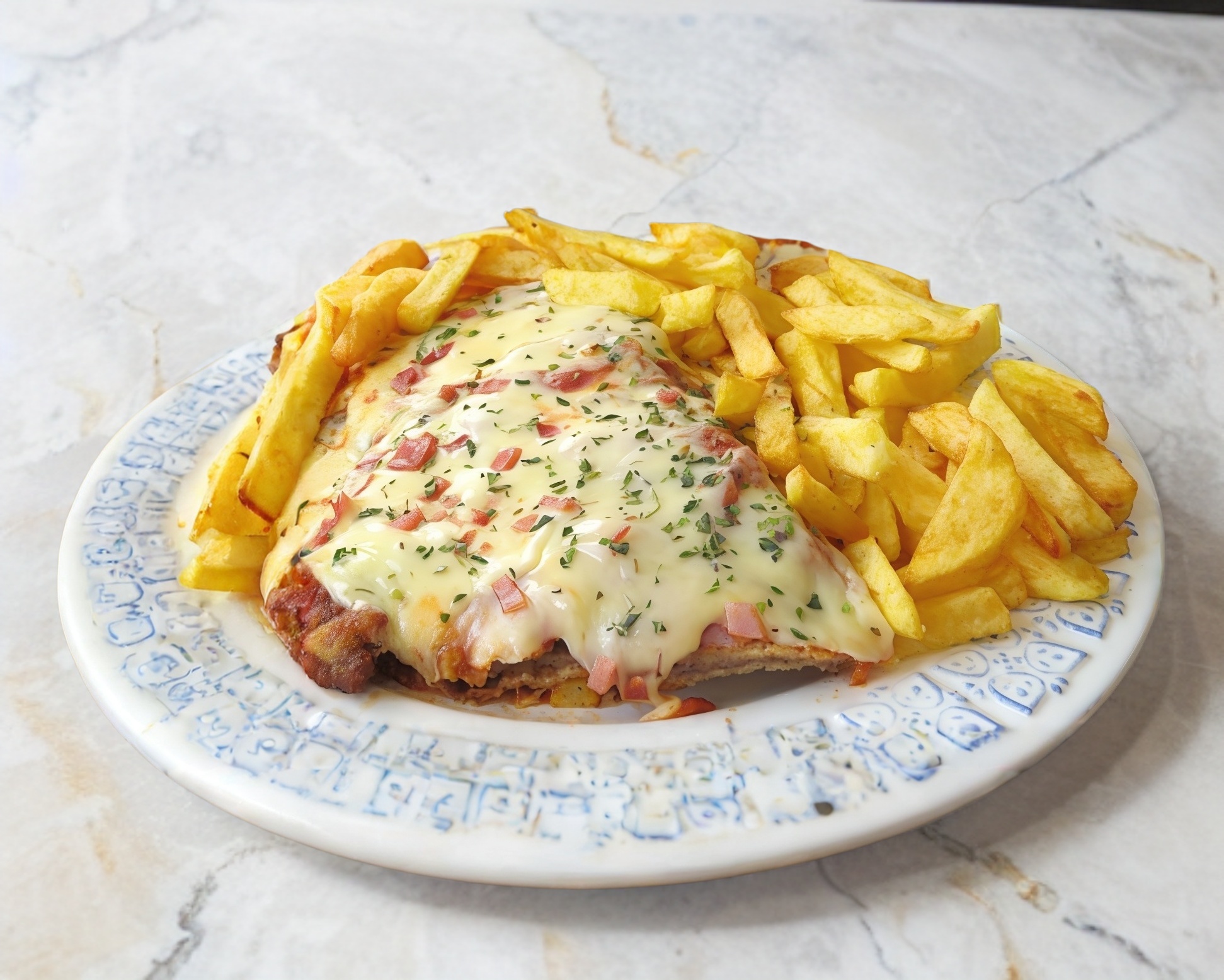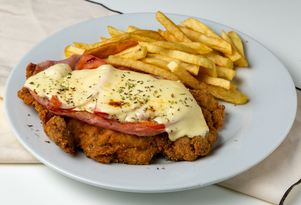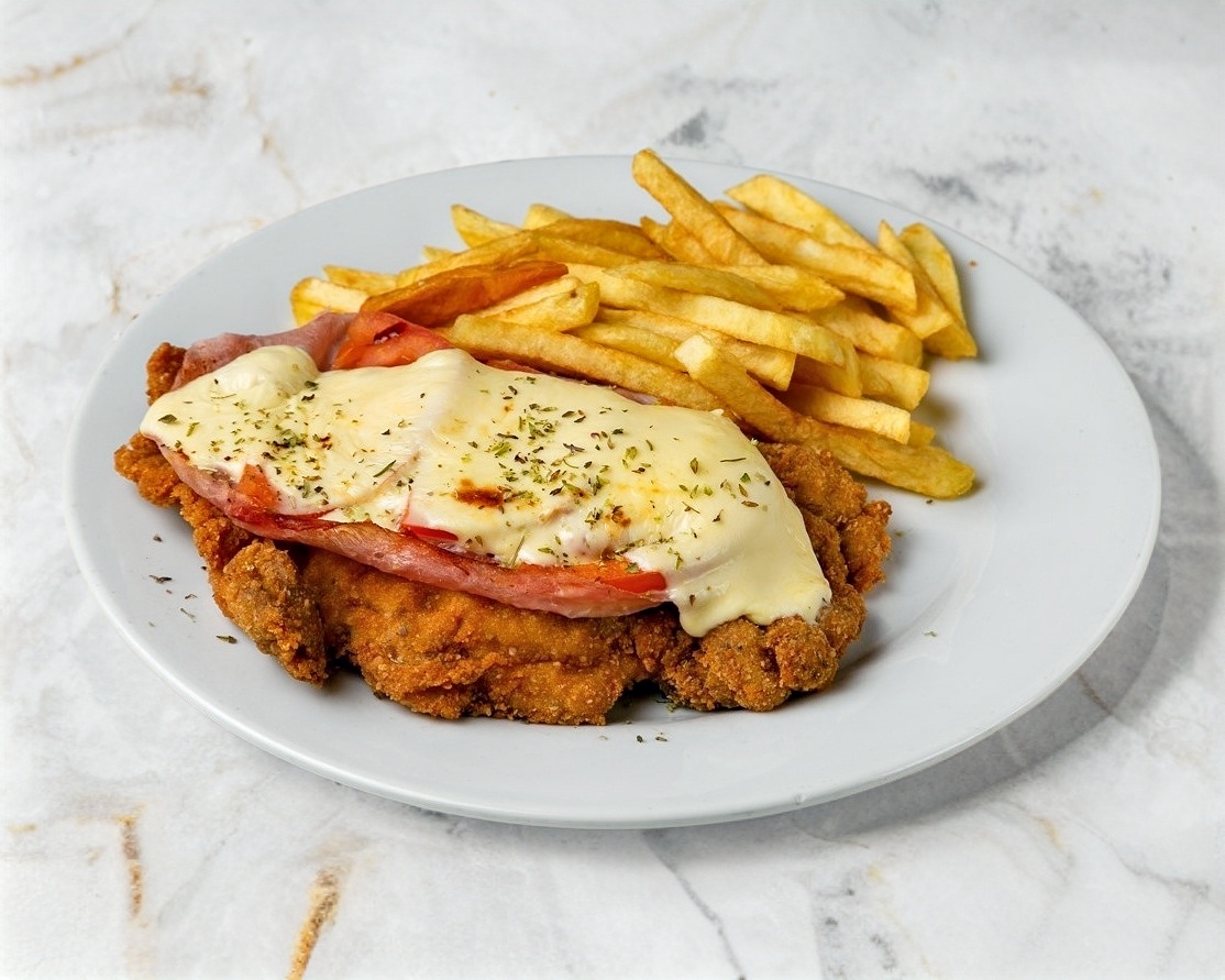 Milanesa bañada en salsa italiana, jamón de pechuga de pavo y gratinada con queso manchego, acompañada de papas a la francesa o ensalada mixta.