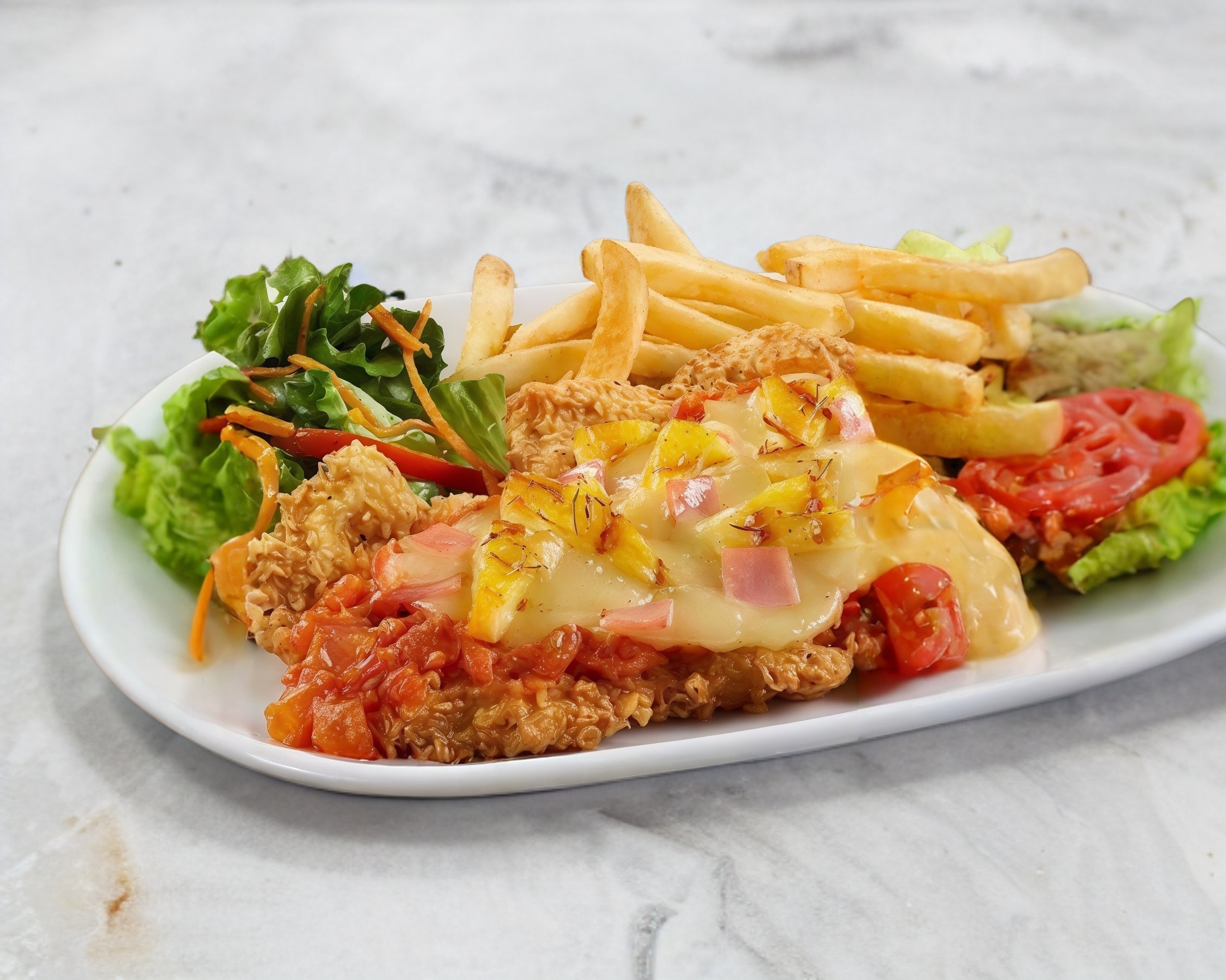 Milanesa con salsa italiana, jamón de pechuga de pavo y piña, acompañada de papas a la francesa o ensalada mixta.
