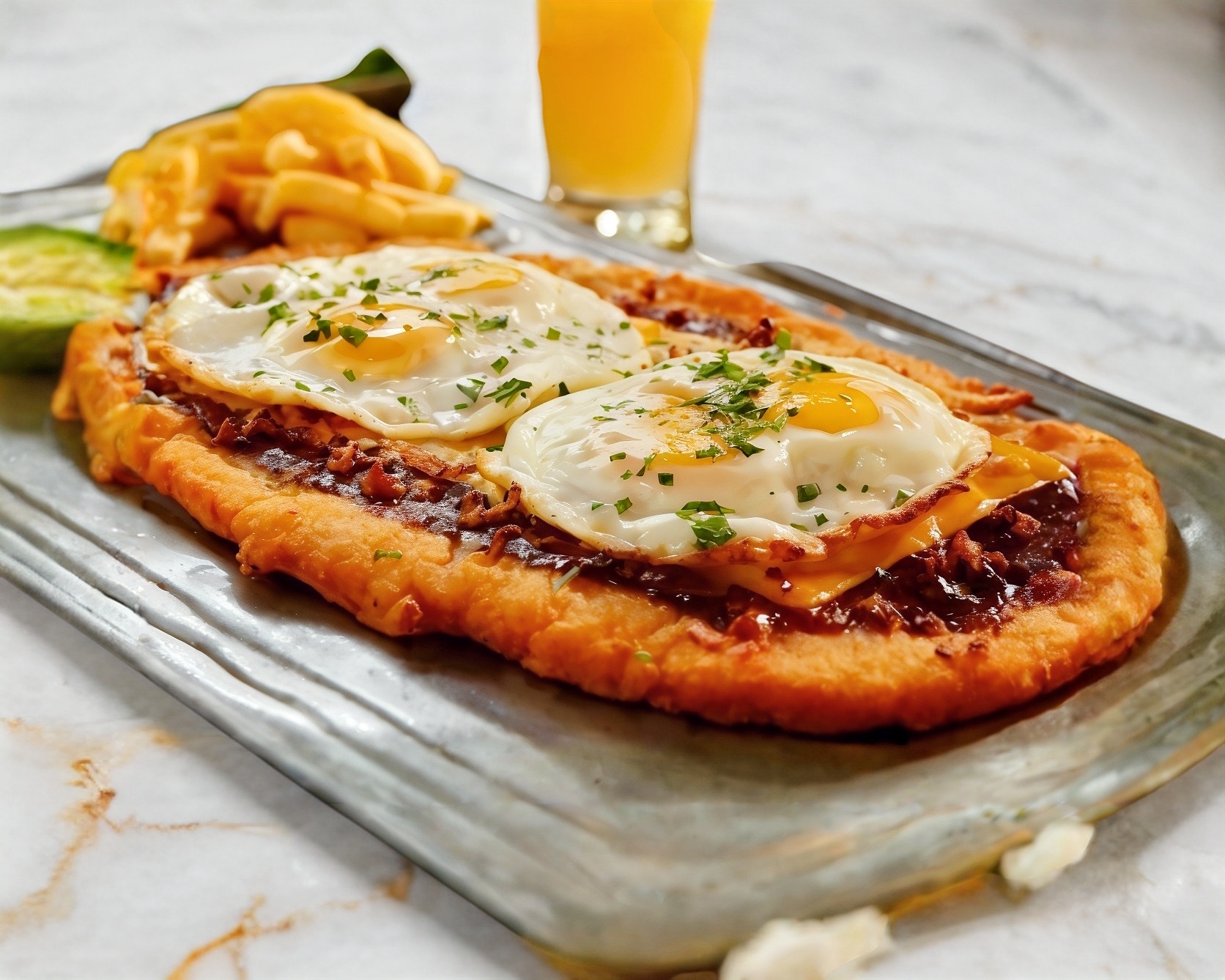 Milanesa empanizada, cubierta con frijoles refritos, coronada con 2 huevos estrellados y tocino frito, acompañada de papas a la francesa o ensalada mixta.