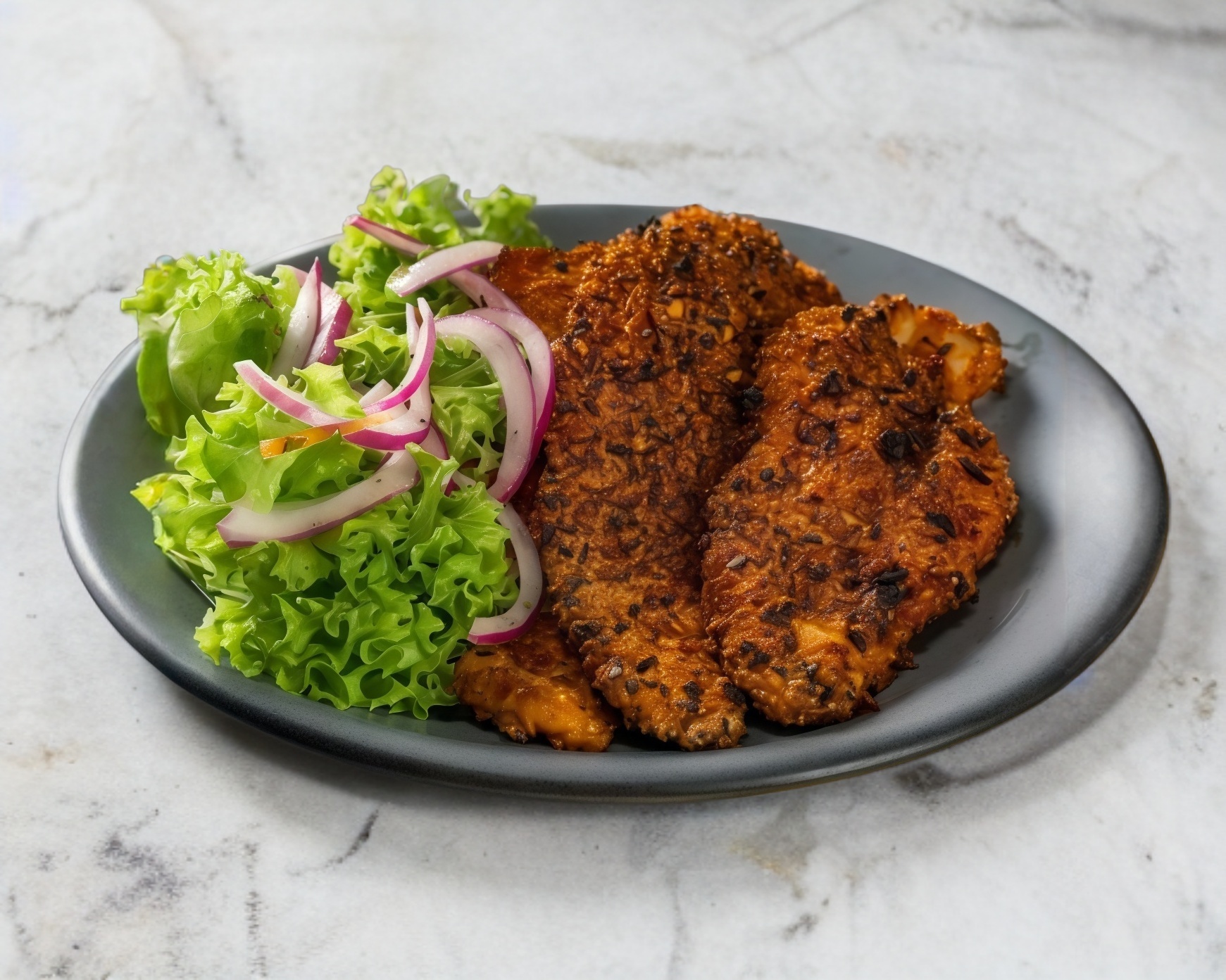 Milanesa empanizada con amaranto, acompañada de papas a la francesa o ensalada mixta.