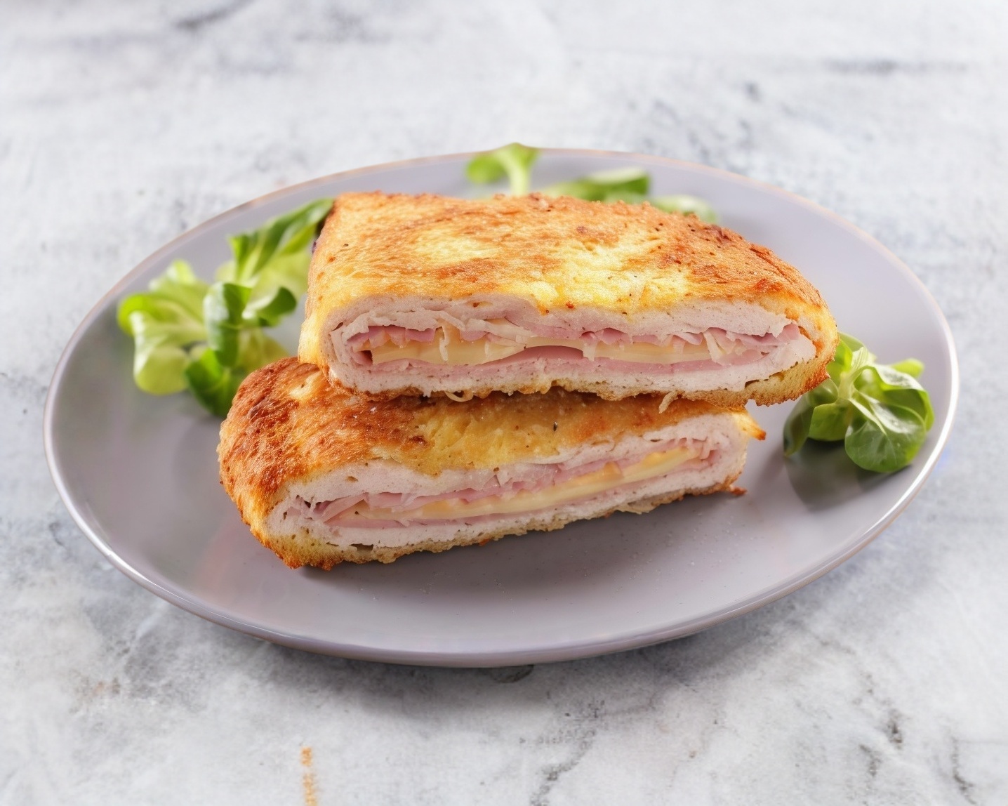 Milanesa empanizada rellena de queso manchego y jamón de pechuga de pavo, acompañada de papas a la francesa o ensalada.