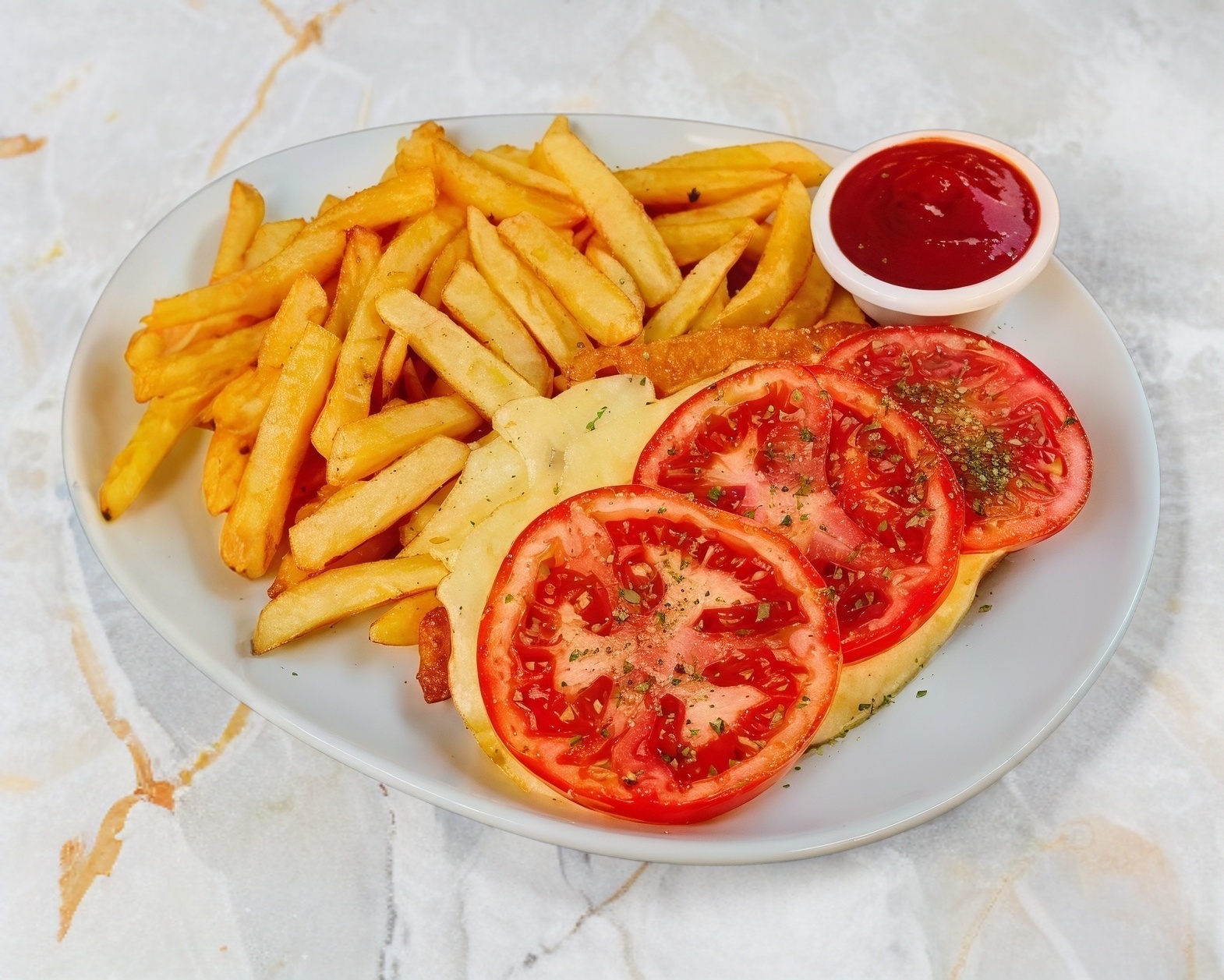 Milanesa empanizada con salsa italiana, queso manchego, rodajas de jitomate y albahaca fresca, acompañada de papas a la francesa o ensalada mixta.