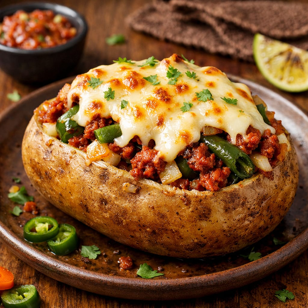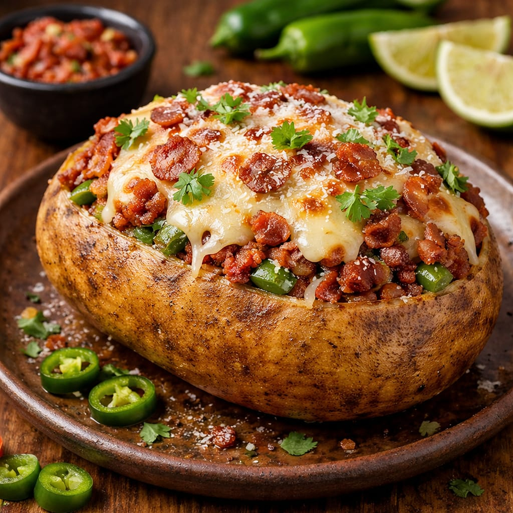 Papa Horno "Mexicana" 🇲🇽🔥 Descripción: ¡Para los que aman el sabor auténtico! Nuestra papa horneada viene rellena con una mezcla perfecta de chorizo dorado, cebollita asada y rajitas de chile cuaresmeño para ese toque picosito que tanto nos gusta. Todo va gratinado con queso manchego fundido. Incluye nuestra salsa de chile morita y el aderezo especial de la casa. ¡Pura delicia nacional!