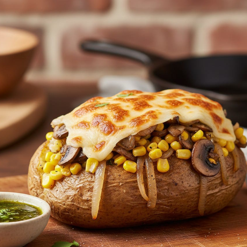 Papa al Horno "Campirana Cheese" 🌽🍄 Descripción: ¡La favorita de los amantes del queso y los vegetales! Deliciosa papa horneada rellena con una mezcla de champiñones frescos, granos de elote tierno y cebollita, todo asado a la plancha para resaltar su sabor. Coronada con abundante queso manchego gratinado. Acompañada de nuestra salsa de chile morita y aderezo especial de la casa.