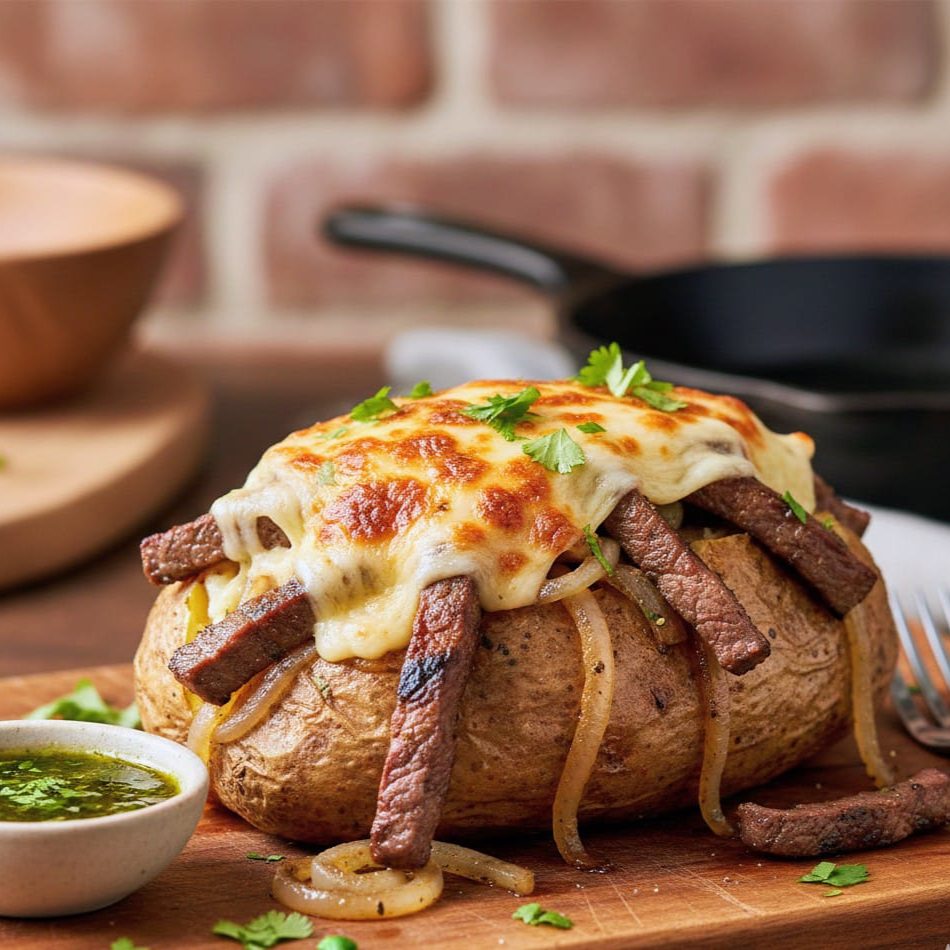 Papa al Horno "Don Toribio" 🥔🔥 Descripción: Nuestra especialidad insignia. Una generosa papa horneada a la perfección, rellena con suave cebollita asada y jugoso bistec de res picado. Cubierta con una capa dorada de queso manchego gratinado que se funde en cada bocado. Acompañada de nuestra salsa secreta de chile morita y el aderezo especial de la casa. ¡Simplemente irresistible!
