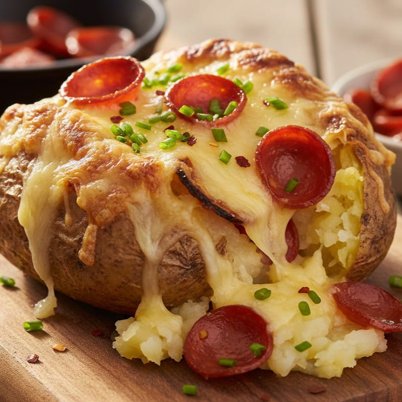 Papa al Horno "A la Italiana" 🍕 Descripción: ¡Lo mejor de dos mundos! Nuestra deliciosa papa horneada rellena con láminas de pepperoni crujiente y una generosa capa de queso manchego gratinado al horno. Disfruta esa combinación clásica italiana con el toque único de nuestra salsa de chile morita y aderezo especial de la casa. ¡Te va a encantar!