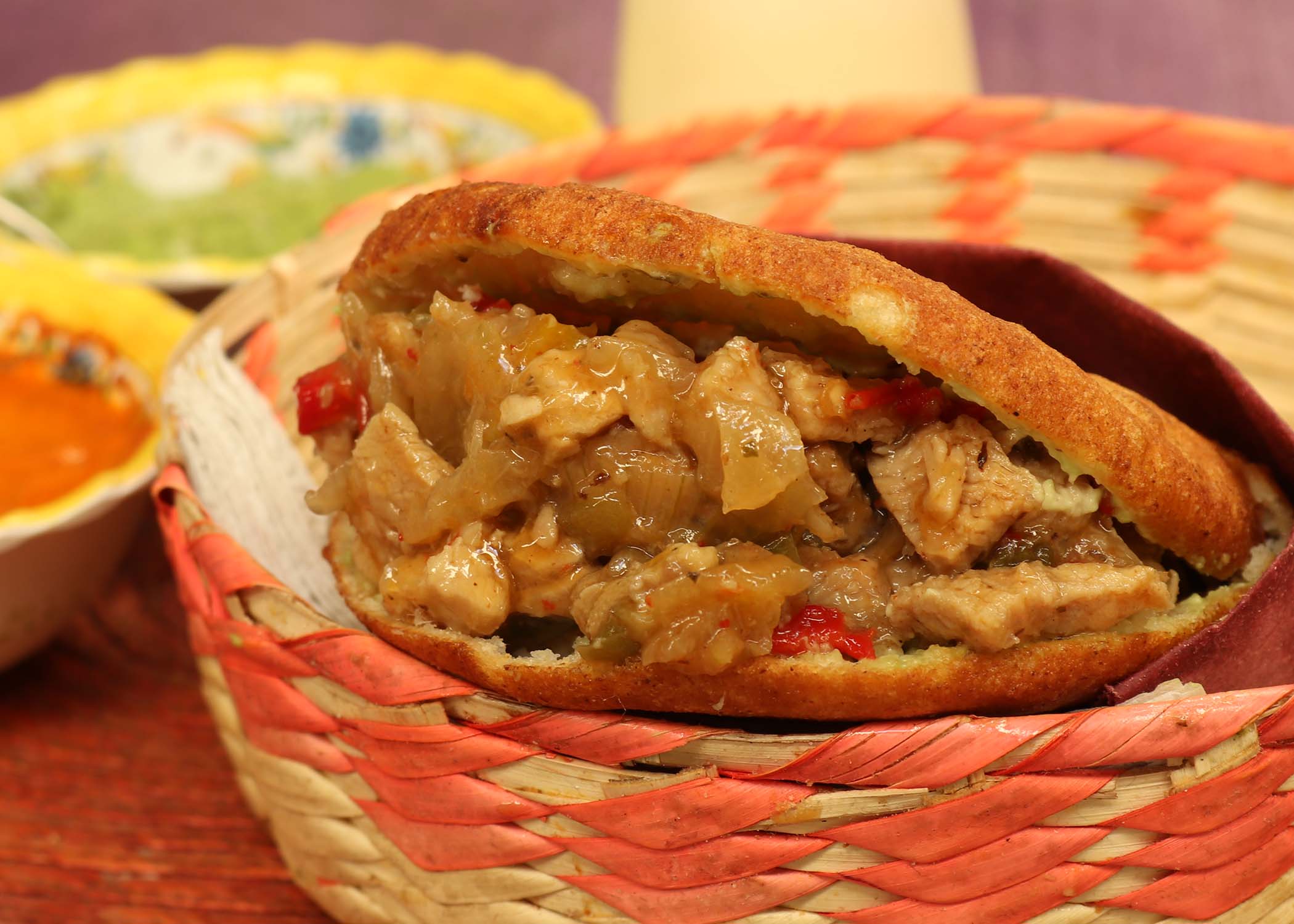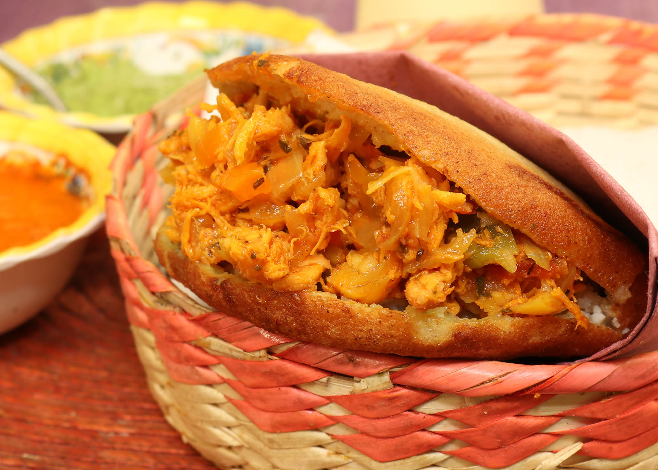 Empanada de harina de maíz rellena de carne deshebrada guisada.