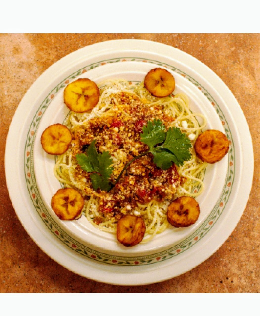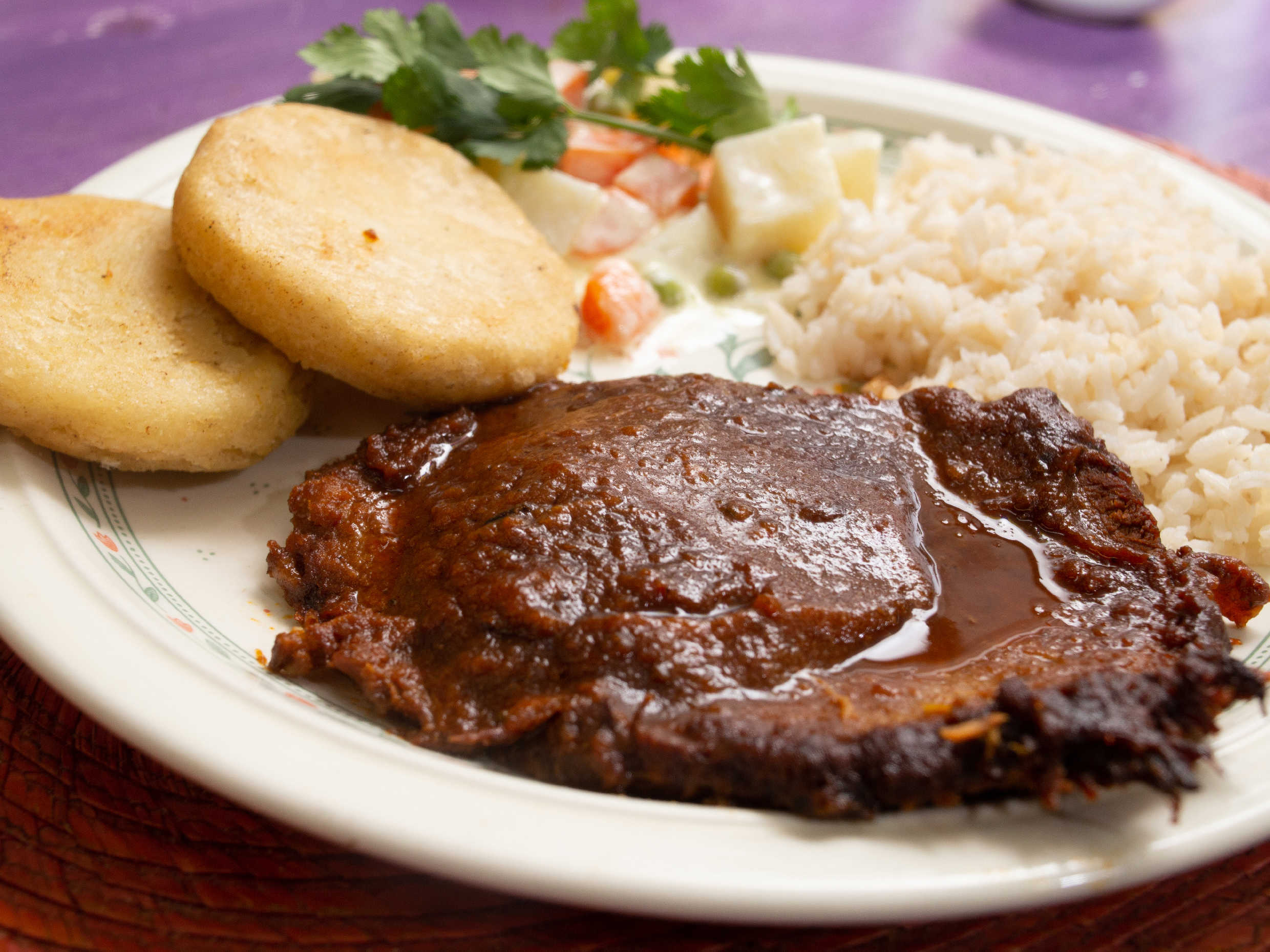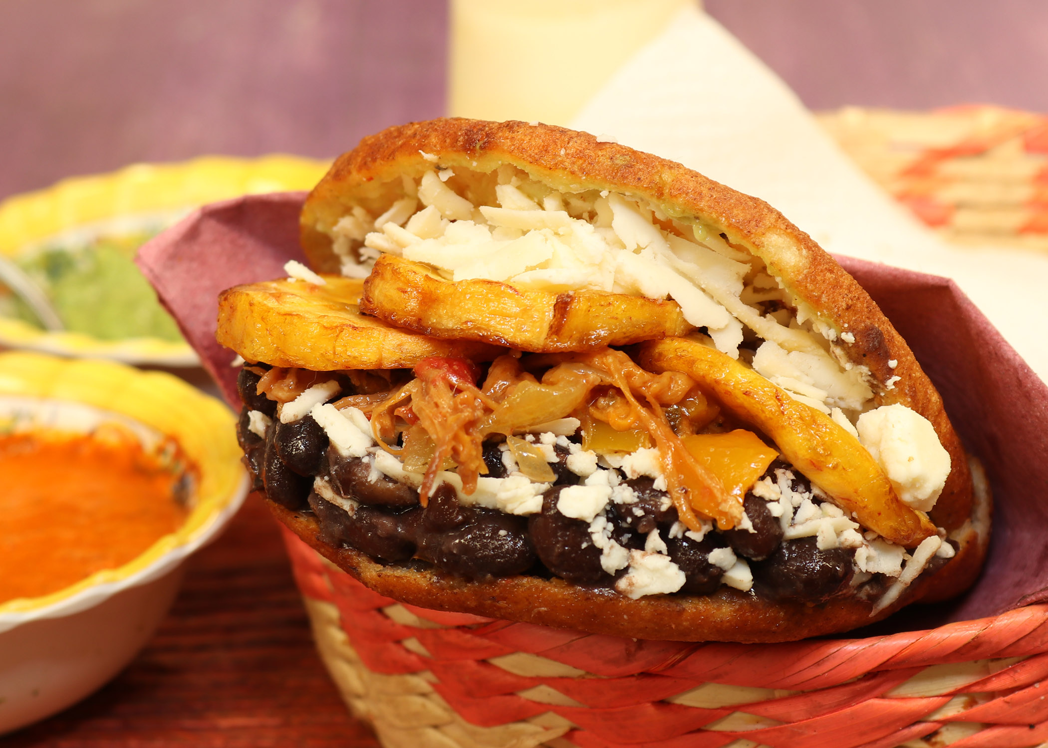Empanada de harina de maíz rellena de carne, queso, frijol negro y plátano frito.