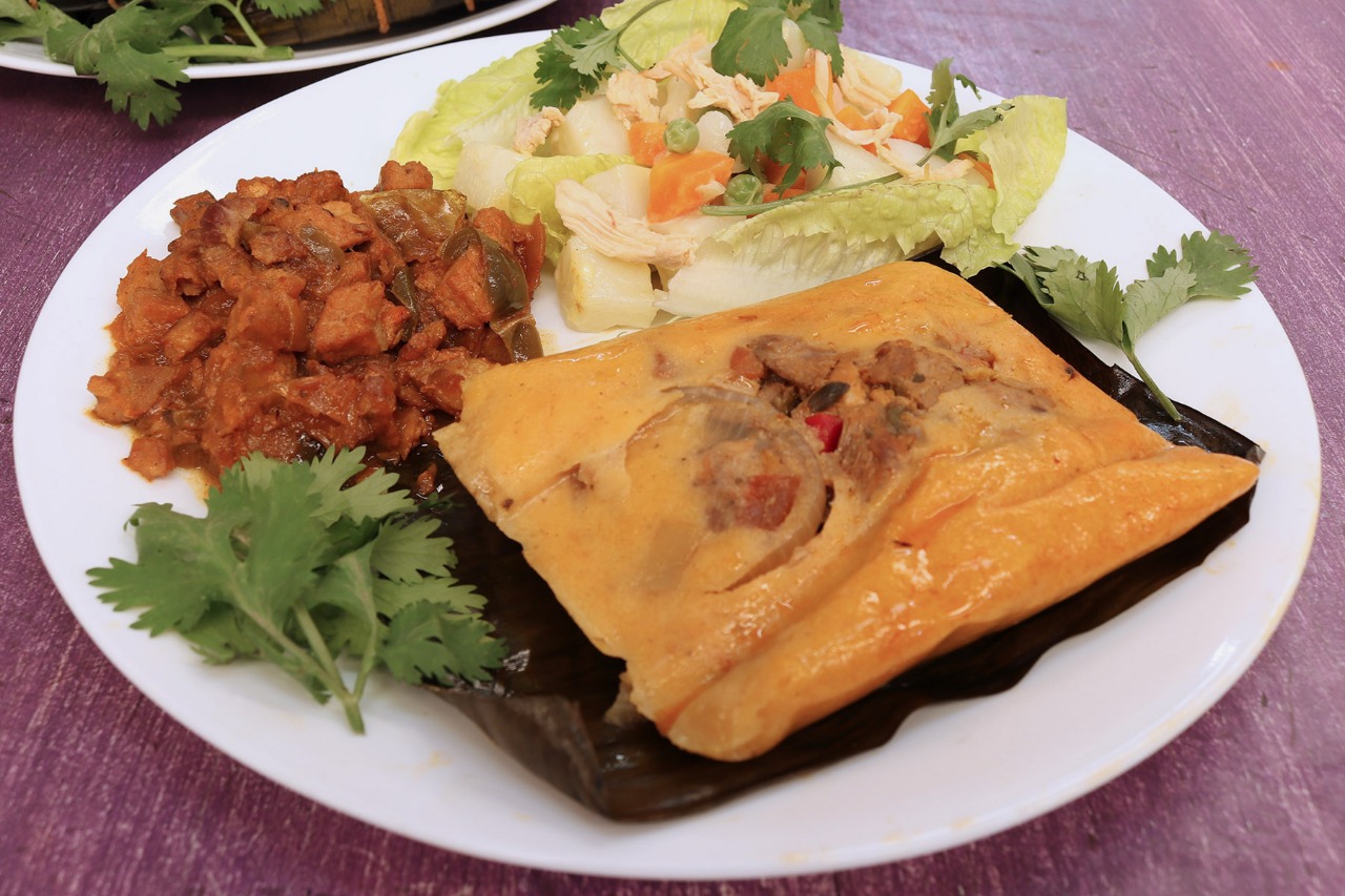 Tamal gourmet con tres tipos carne ( res, cerdo y pollo), con un exquisito guiso elaborado con vino, sofrito, aderezo y alcaparras. Con adornos de pasas, aceitunas, pimientos, etc.