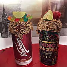 Lata de cerveza de 473ml con chamoy con pulpa de tamarindo en la punta acompañada de limón.