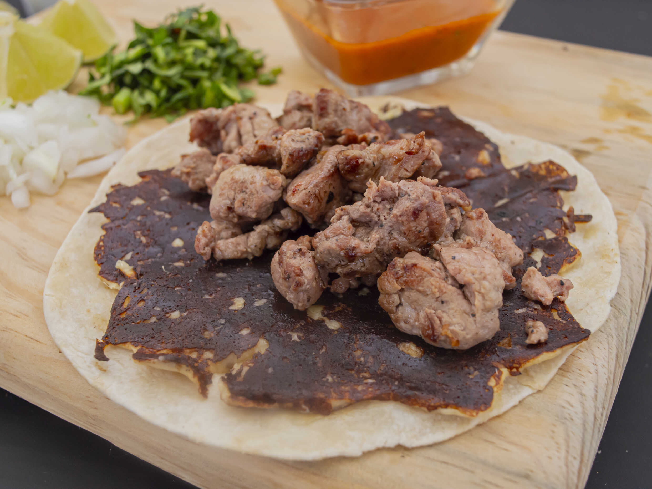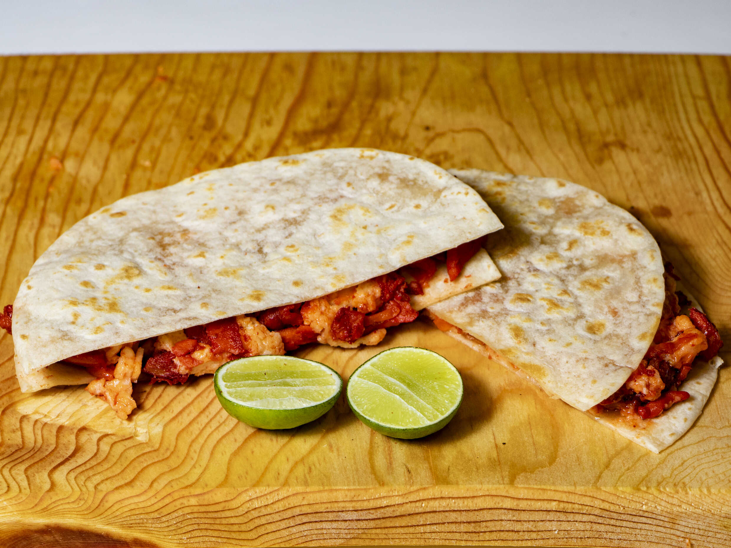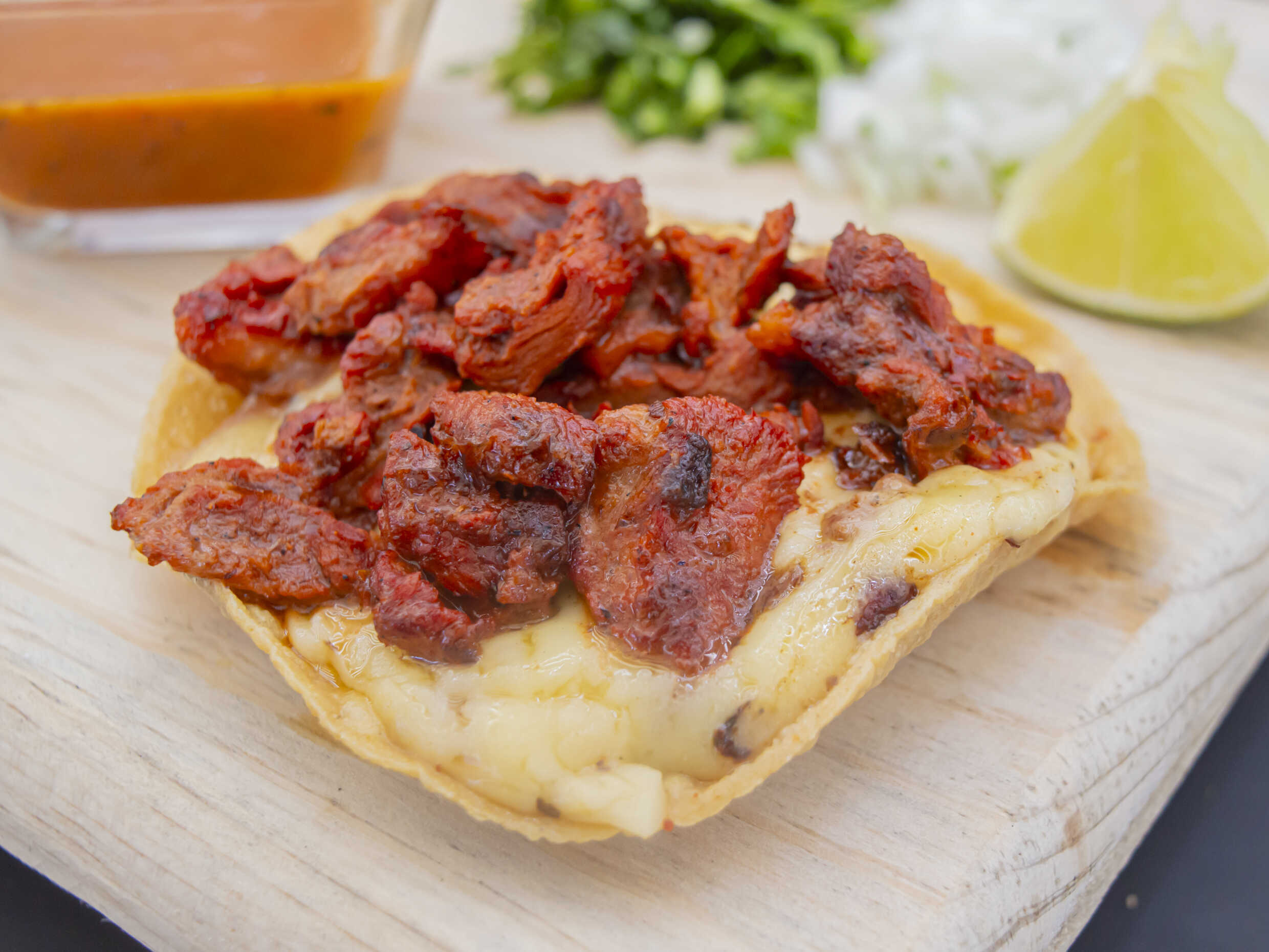 110 g Carne al pastor servida sobre una cama de queso oaxaca fundido en una tortilla de harina