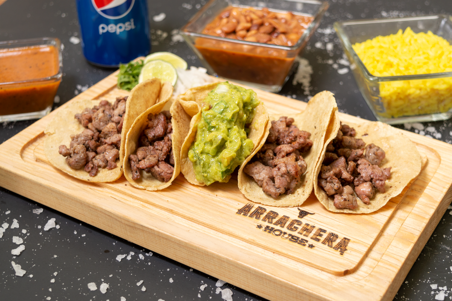 Disfruta de 3 tacos de arrachera con queso, envueltos en tortillas de harina calientes y suaves. Acompañados de deliciosas papas a la francesa. Completa tu experiencia con un refresco de 355 ml a tu elección.