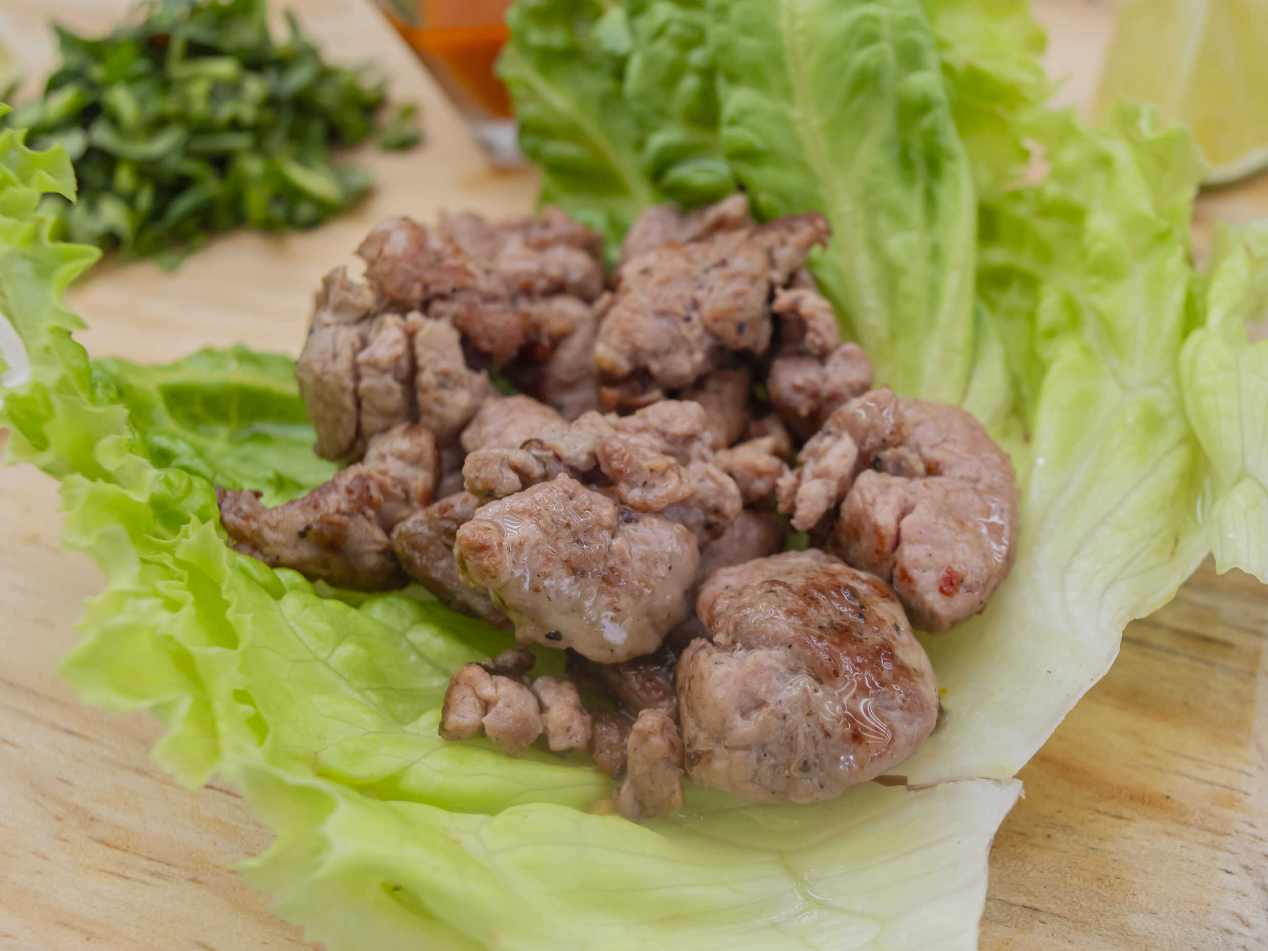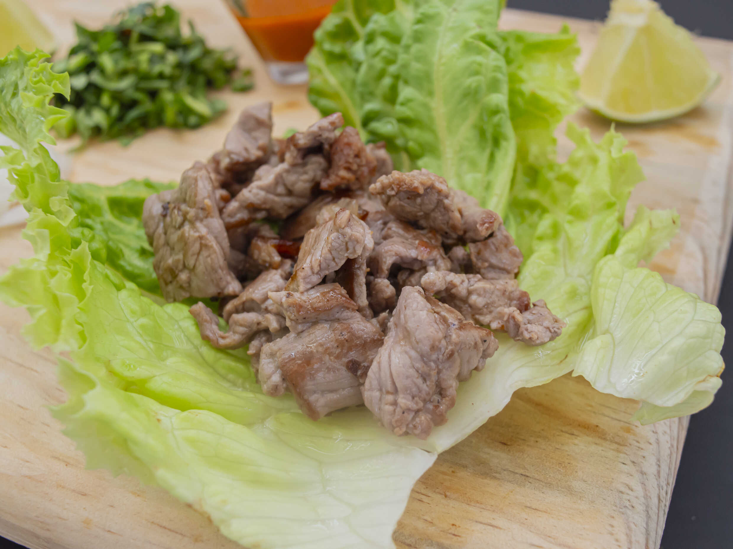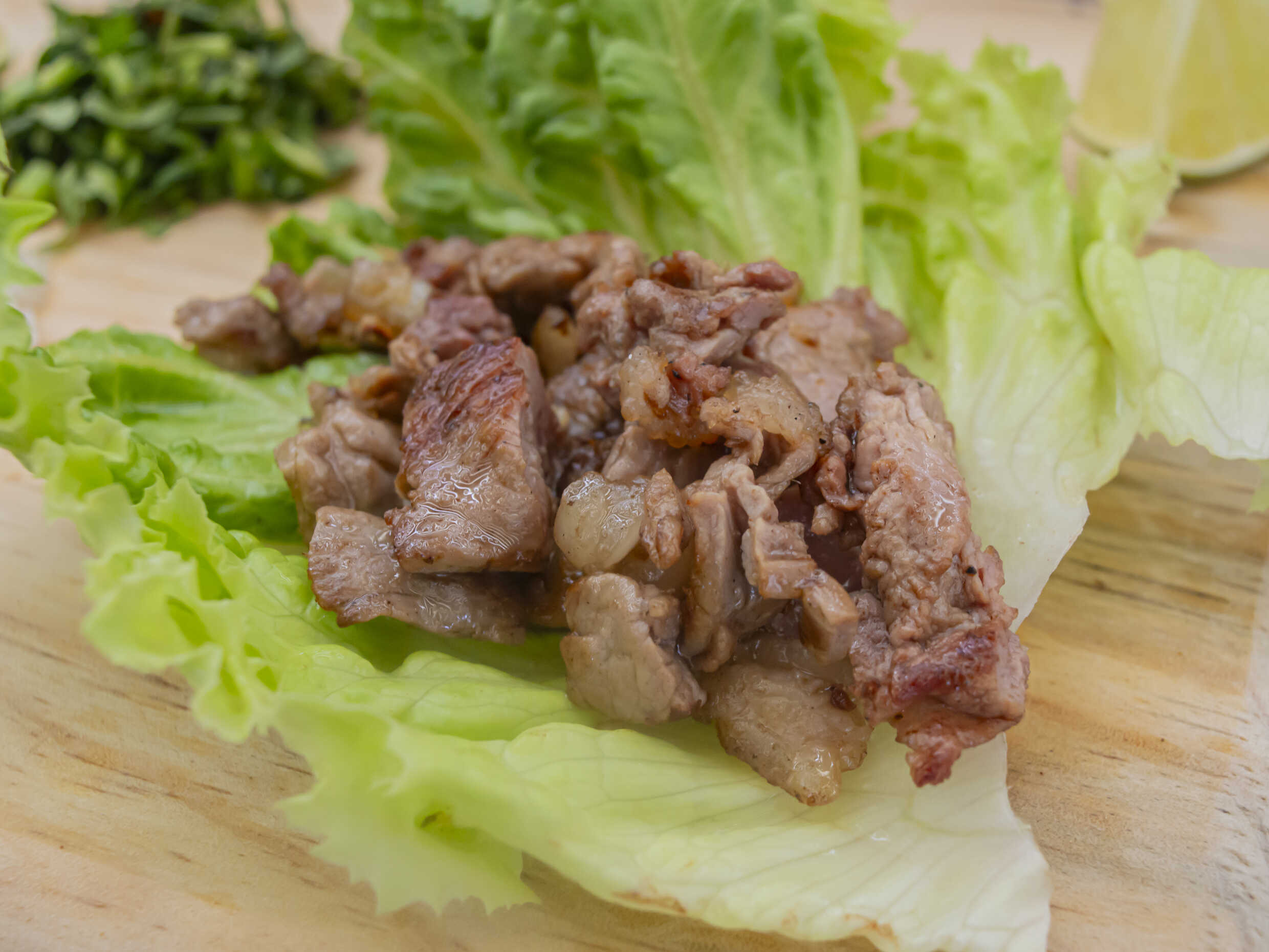 50 g de Arrachera servida con una hoja de lechuga por pieza