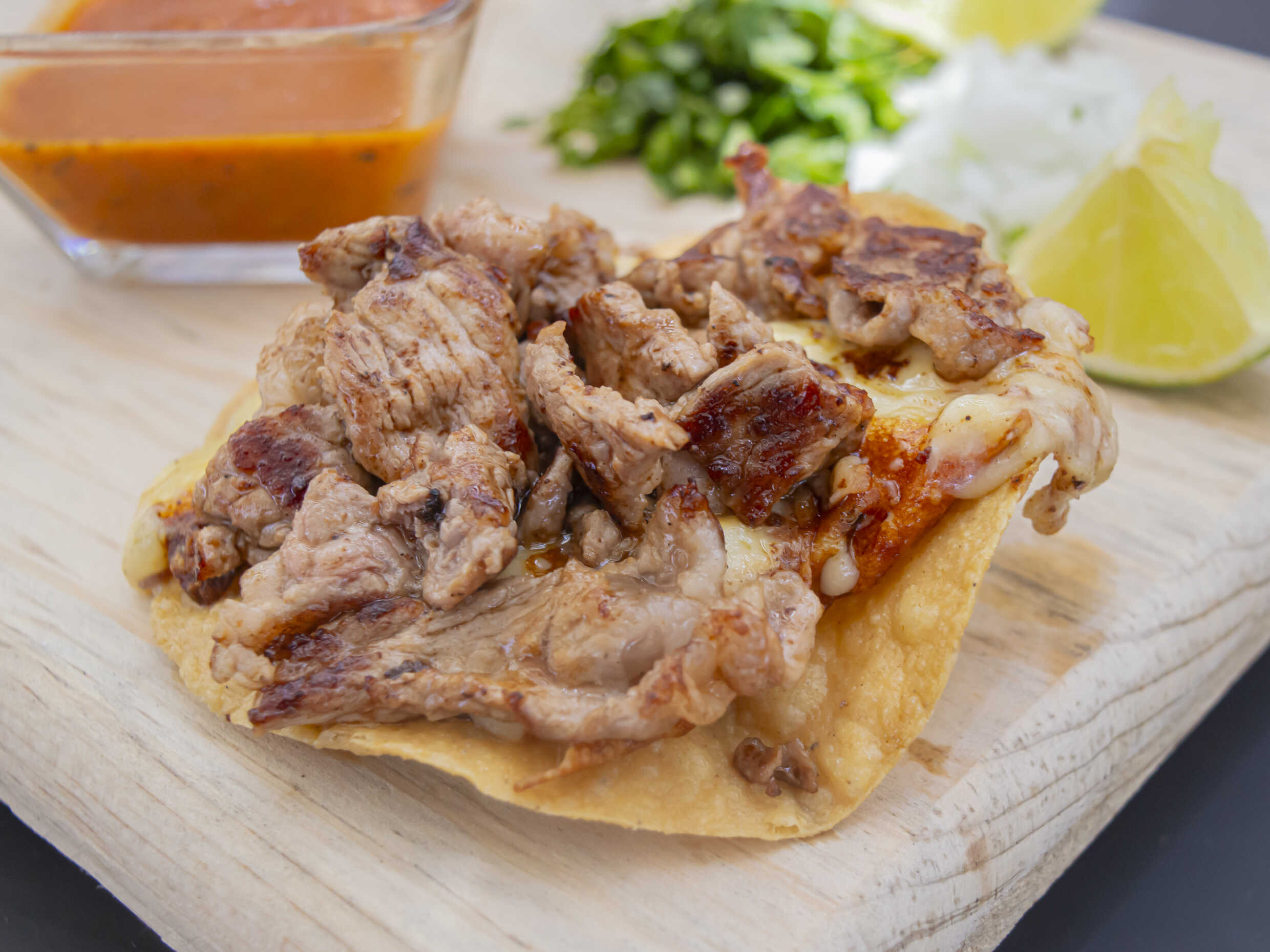 40 g de queso oaxaca gratinado, sobre una tostada, acompañada de 40 g de Pastor picado