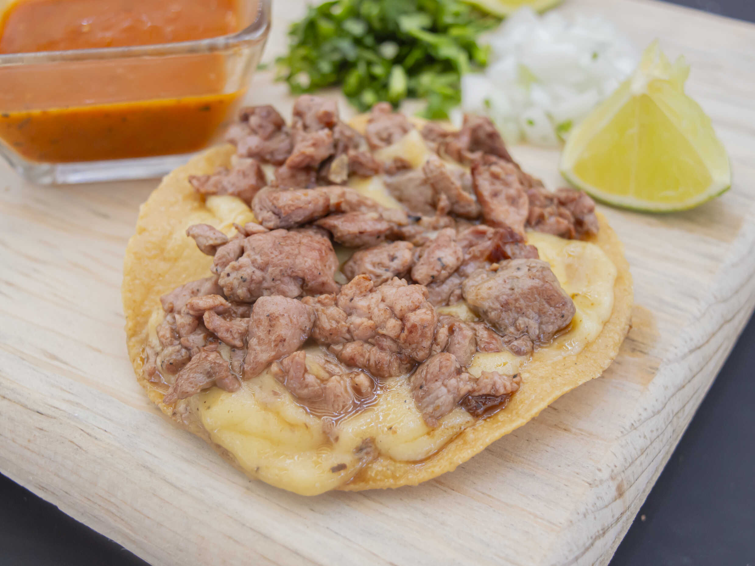 40 g de queso oaxaca gratinado, sobre una tostada, acompañada de 40 g de Arrachera picada