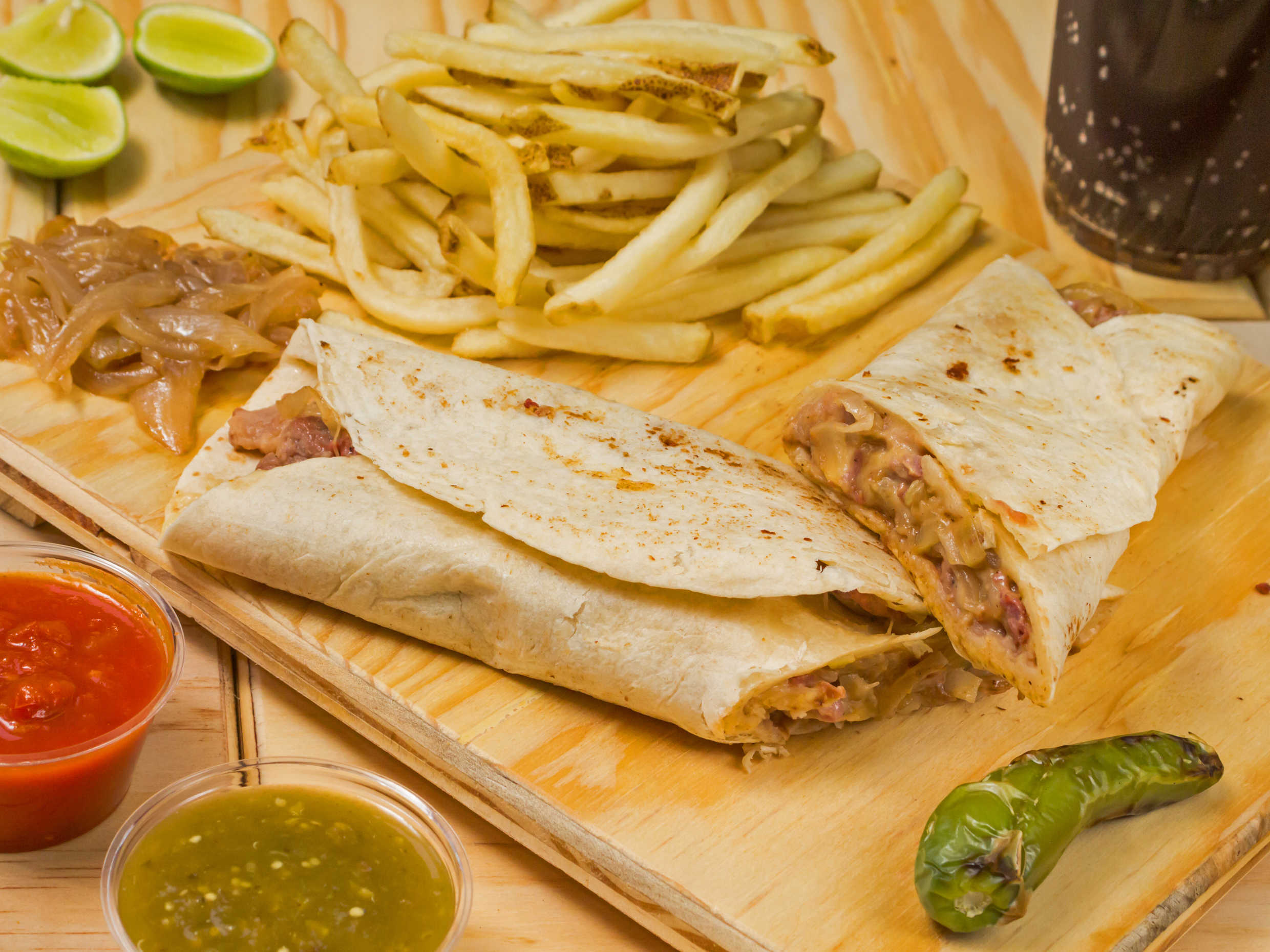 Exquisito Burrito de Arrachera, relleno con tierna carne de arrachera, frijoles, cebolla caramelizada y queso derretido. Acompañado de crujientes papas a la francesa y un refresco de 355 ml a tu elección