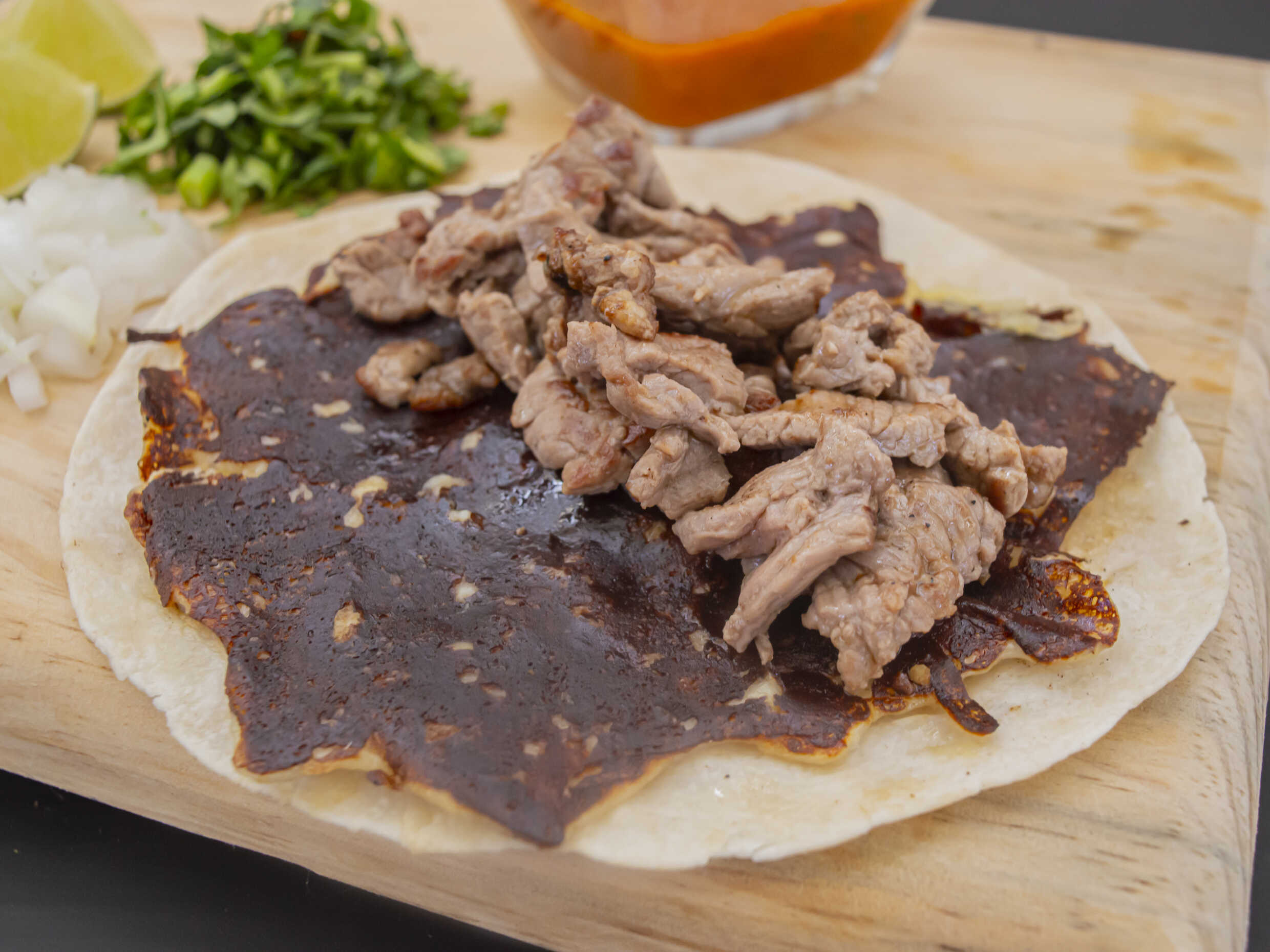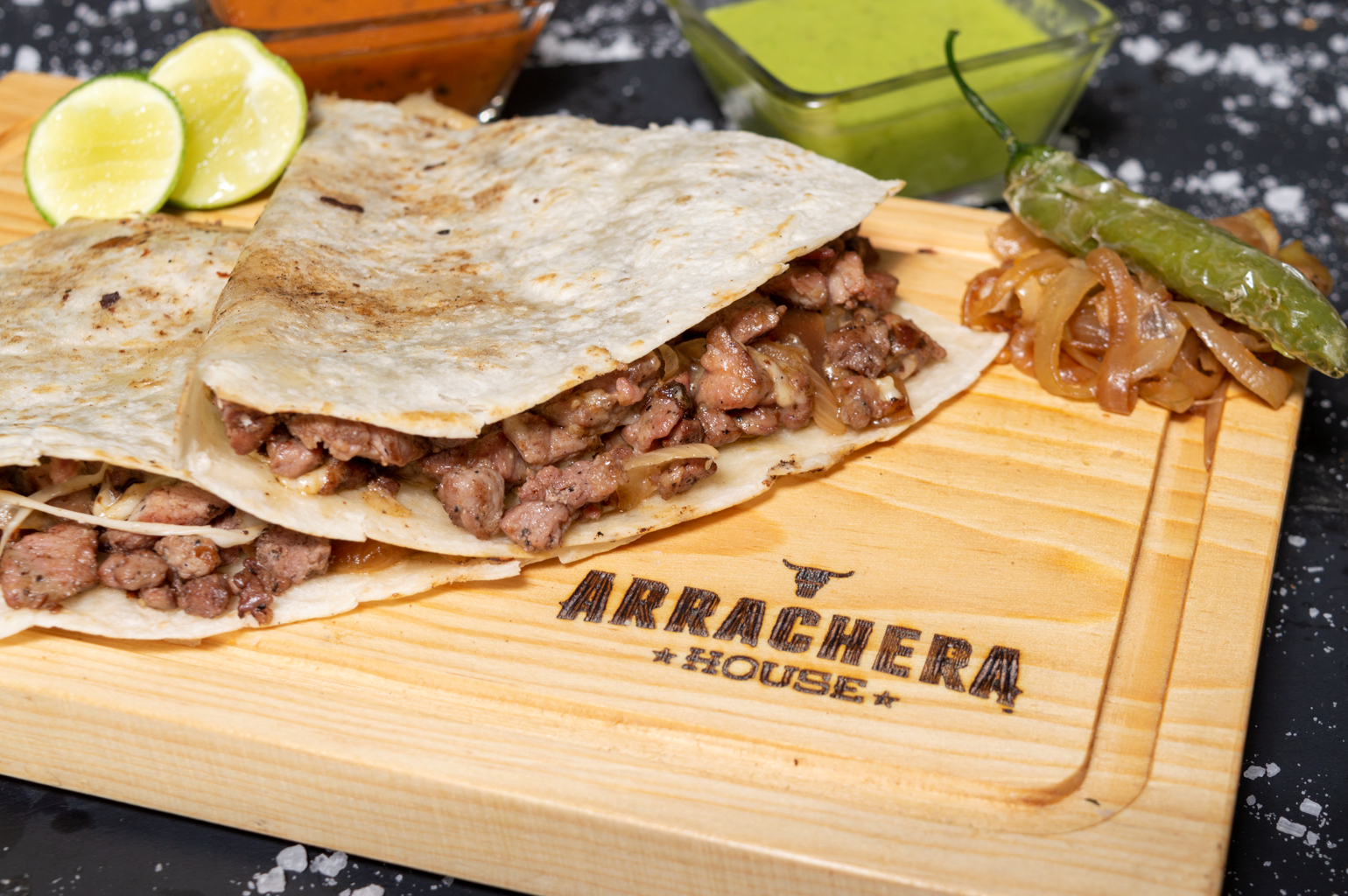 110 g Carne de arrachera fileteada servida en una tortilla de harina con una base de queso oaxaca.