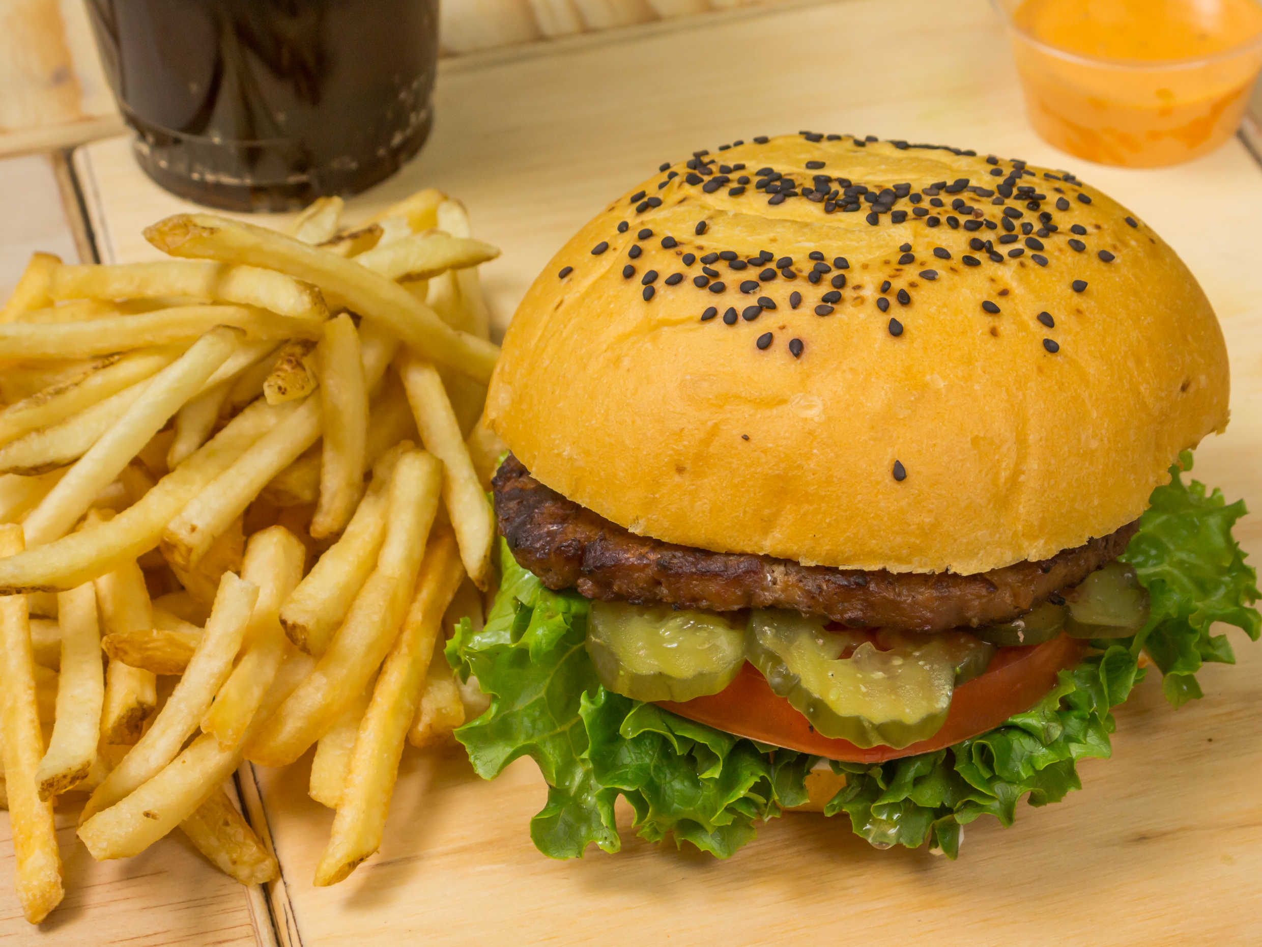 Hamburguesa, pollo empanizado, lechuga, jitomate, pepinillos, mayonesa, papas a la francesa, refresco 355 ml a elección.