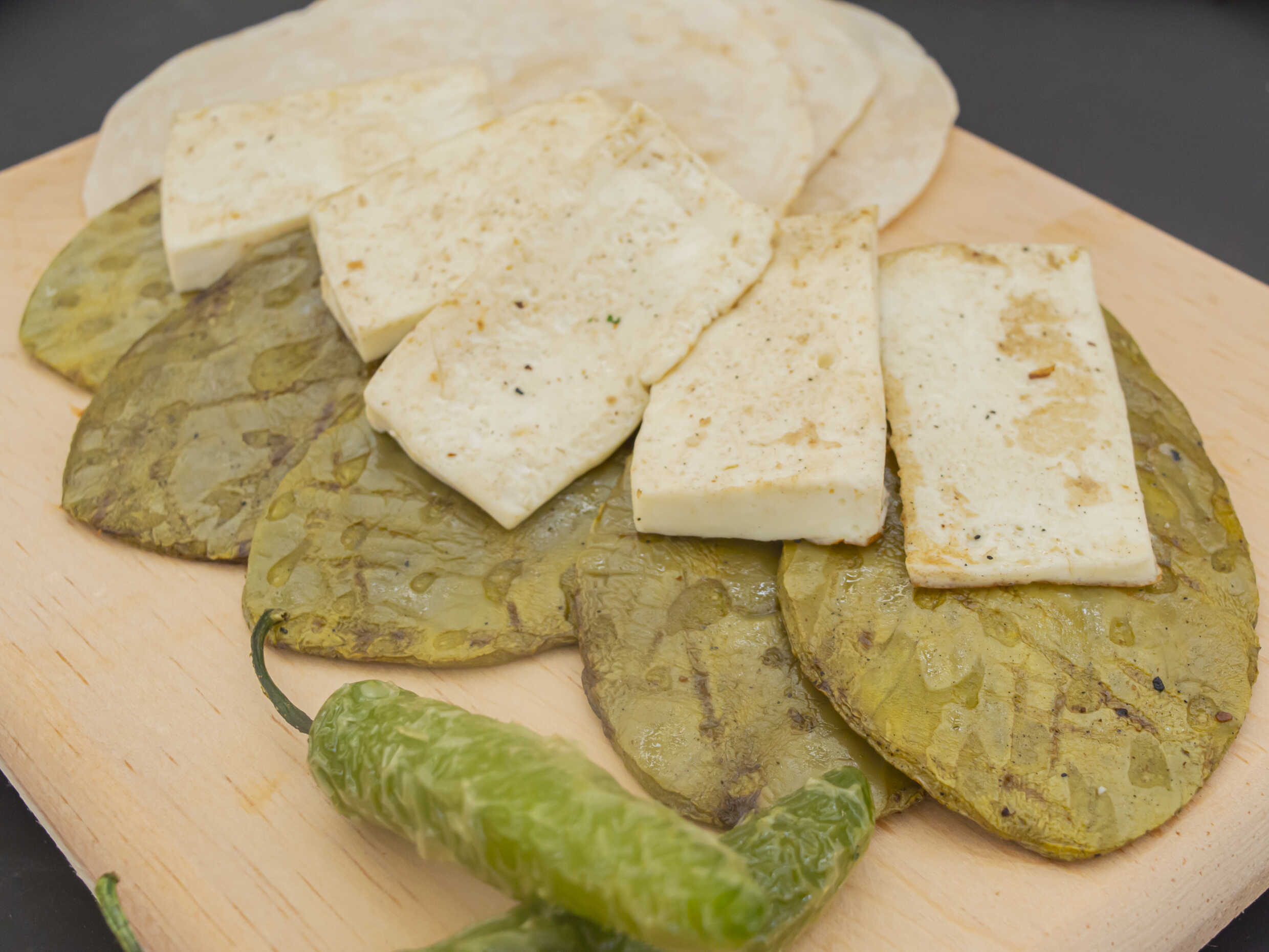 5 piezas + 95 g queso + 3 tortillas de harina Nopales de cambray tiernos acompañados de queso panela dorado en la plancha