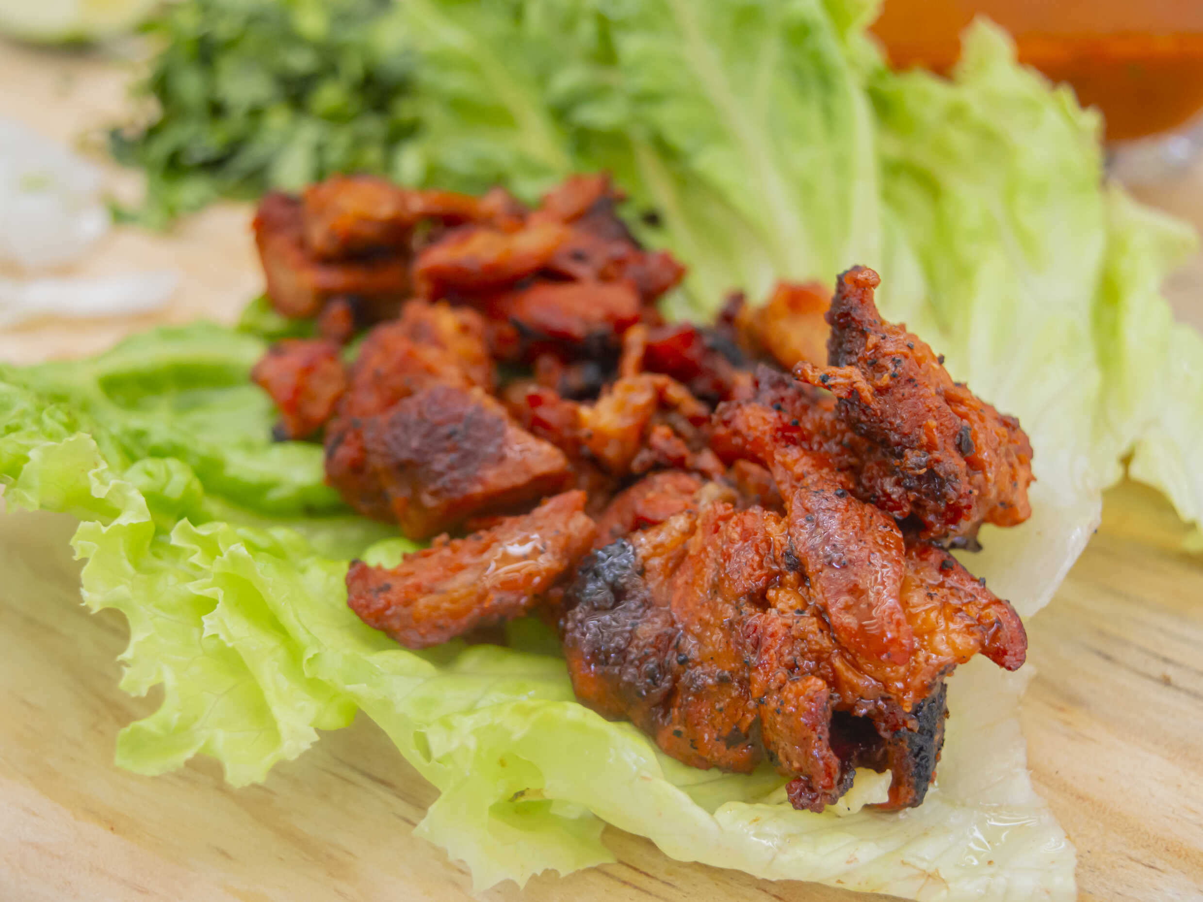 80 g de carne pastor servido en una hoja de lechuga, acompañados de cebolla, cilantro y piña