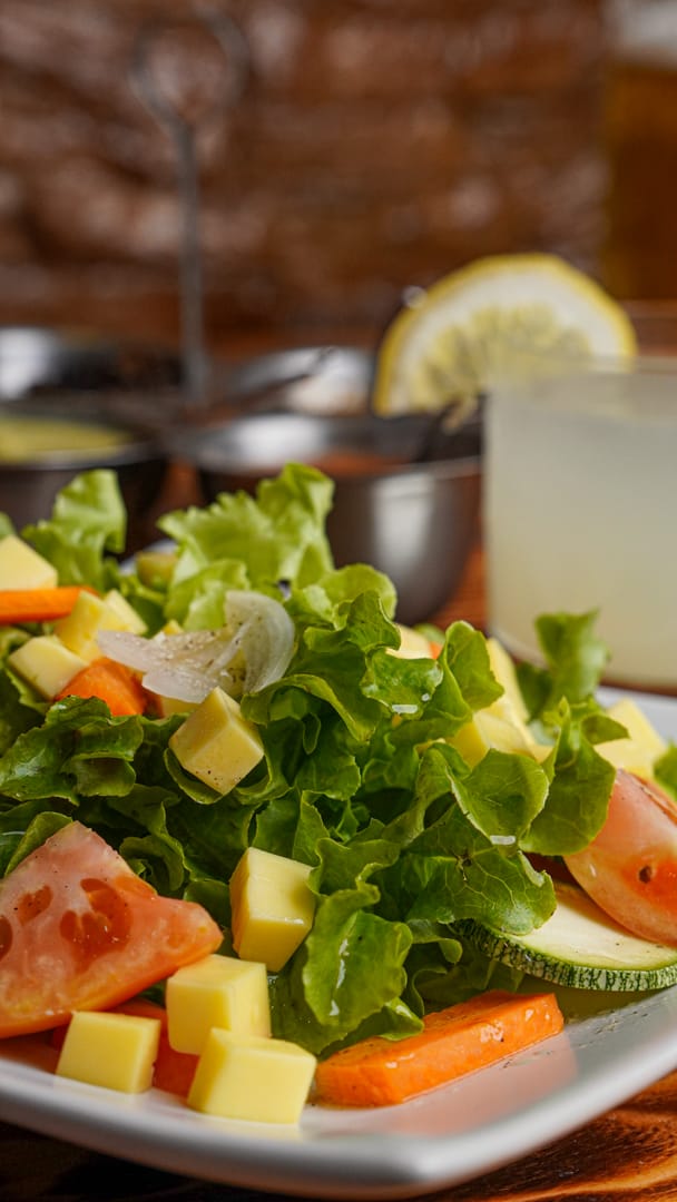 Lechuga, jitomate, zanahoria, calabaza, julianas de cebolla, cubos de queso menonita, bañada con el aderezo de la casa.