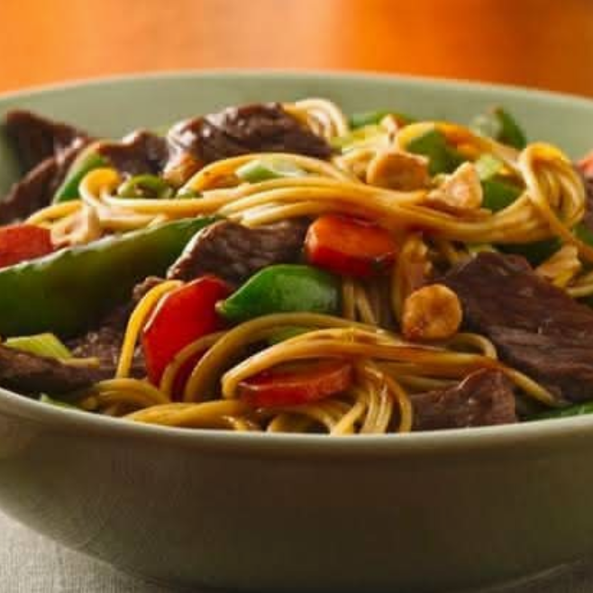 Espagueti con tiras de res y vegetales: zanahoria, pimiento y ejote.