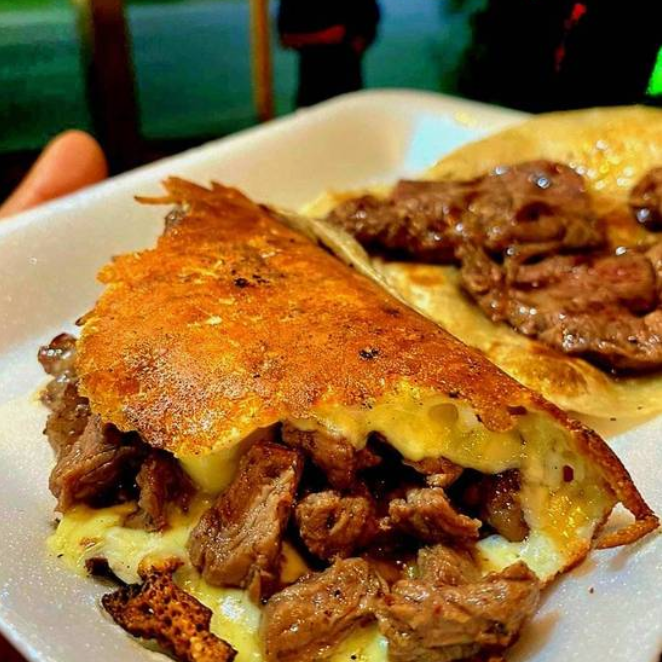 Costra de queso dorado rellena de carne de res, crujiente por fuera y cremosa por dentro.
