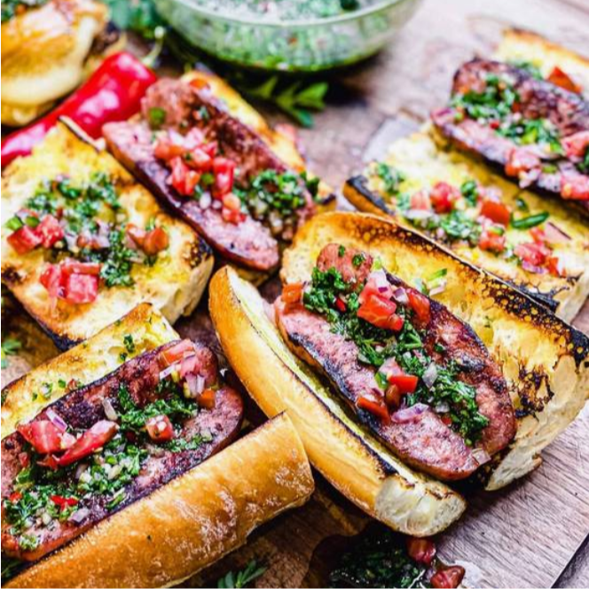 Clásico choripán con chorizo en pan tostado, chimichurri y tomate.