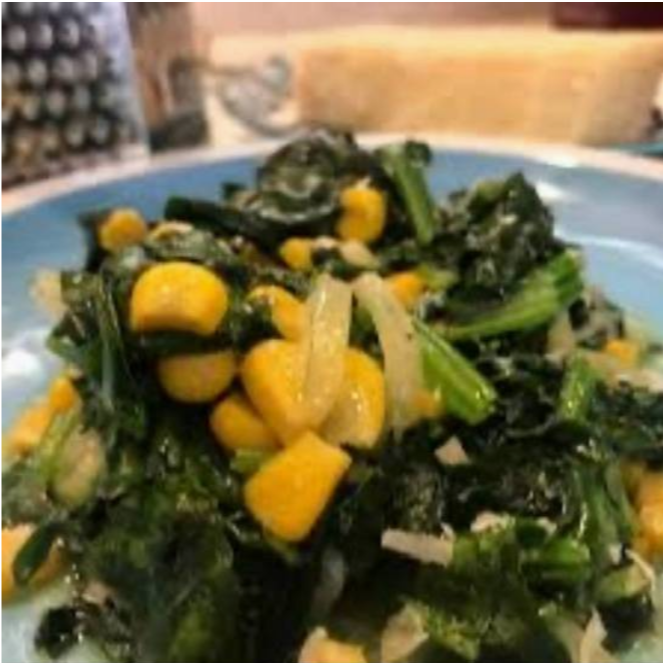 Elotes salteados en mantequilla con cebolla, espinacas y queso.