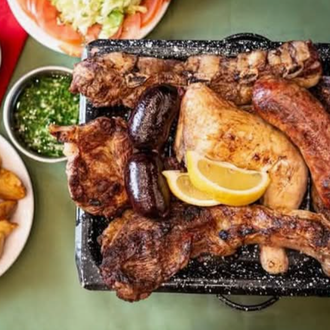 Parrilla para 4 personas de aprox. 1 Kilo incluye: carne de res, costillas de cerdo, pechuga de pollo, Chorizo argentino más 2 guarniciones como ensalada, bollos y salsas adornado con aguacate y queso.