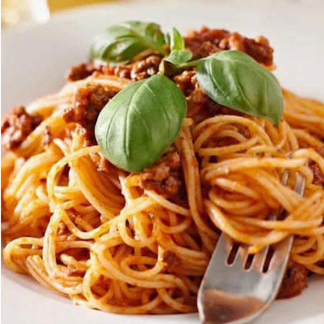 Pasta con salsa boloñesa de carne molida en tomate, coronada con hojas de albahaca.