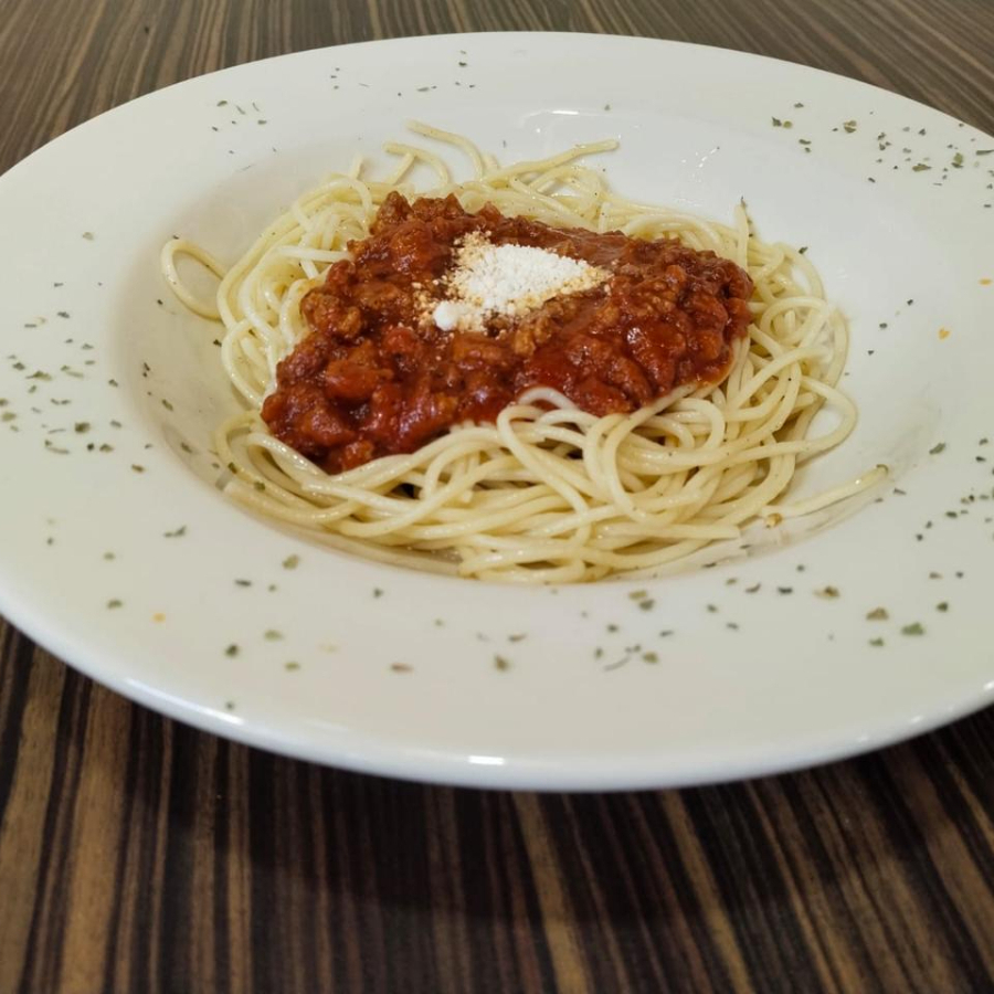 Pasta preparada con salsa de la casa, carne molida, queso parmesano y salteada en mantequilla condimentada
