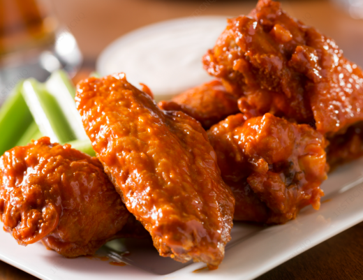 8 piezas de Alitas bañadas en salsa a elegir (BBQ, Mango Habanero o BBQ Búfalo)
